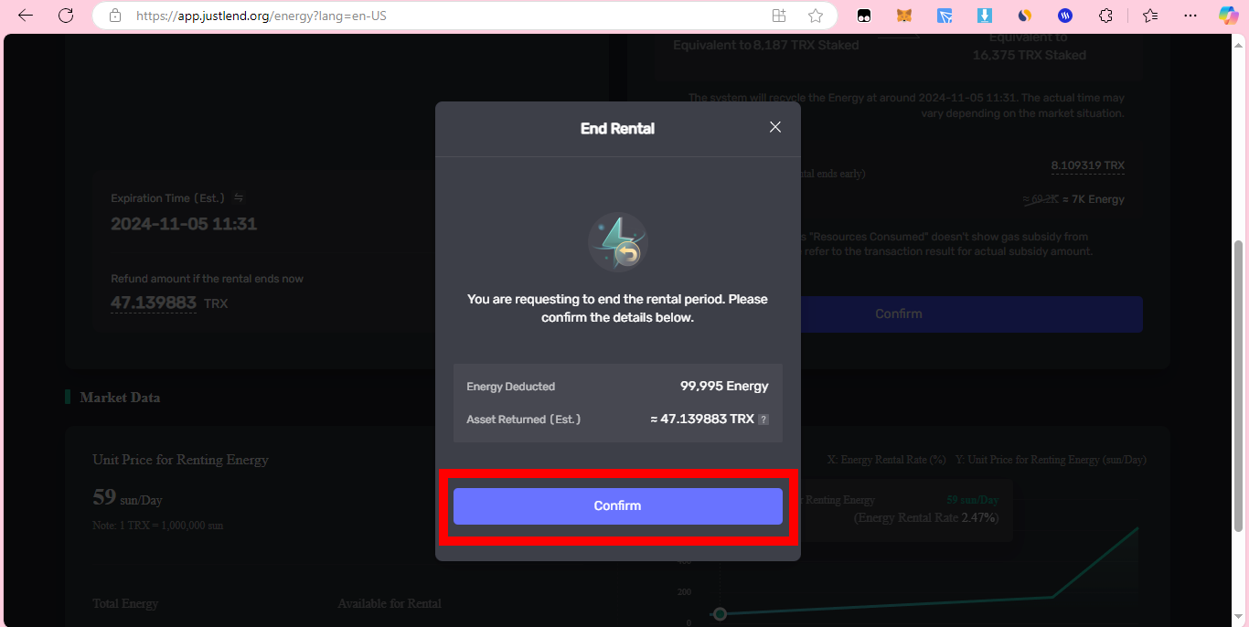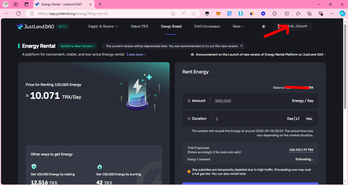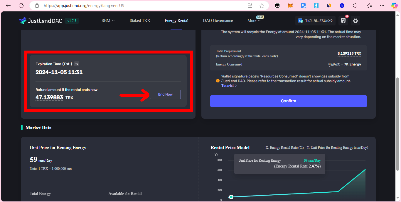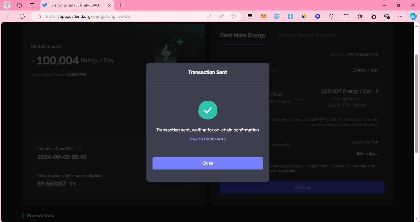✔sign in করার পরে আপনার ট্রান্সাকশন ইন্সট্যান্টলি কমপ্লিট হয়ে যাবে। আর আপনার ওয়ালেটও দেখতে পাবেন আপনার এনার্জি অ্যাড হয়ে গিয়েছে। এটি আপনি যতদিনের জন্য নিয়েছেন সেই টাইম শেষ হওয়ার পরে আবার আপনার ওয়ালেটের মেইন ব্যালেন্সে অ্যাড হয়ে যাবে। তবে আপনার এনার্জি রেন্ট শেষ হওয়ার আগে যে সাইটে রেন্ট নিয়েছেন, সেখানে "END NOW" অপশনে ক্লিক করতে হবে, নাহলে আপনি সিকিউরিটি ডিপোজিট এর জন্য যে TRX কেটেছিল সেটা ফেরত পাবেন না, শুধু প্রিপেইড রেন্টটাই ফেরত পাবেন অটোমেটিক্যালি রেন্ট এর সময় শেষ হয়ে গেলে। তবে এনার্জি ভাড়া নেওয়ার পরে ব্যবহার অনুযায়ী খরচ হয়ে গেলে পুরোটা ফেরত পাওয়া যায় না। তবে যদি টোটালি না ব্যবহার করা হয়, তাহলে পুরোটা ফেরত পাবেন।