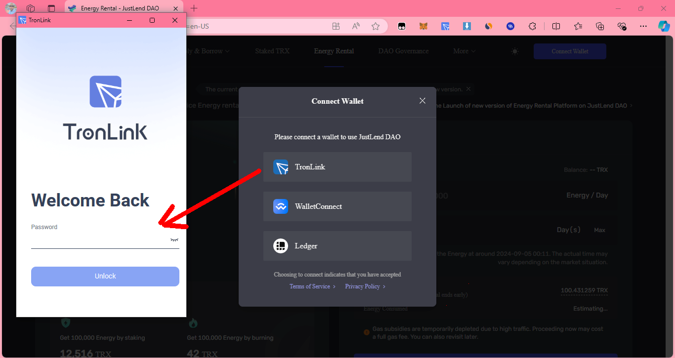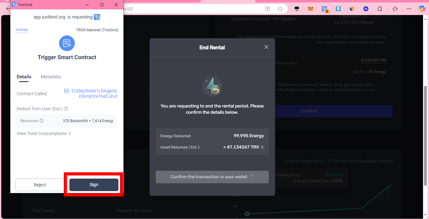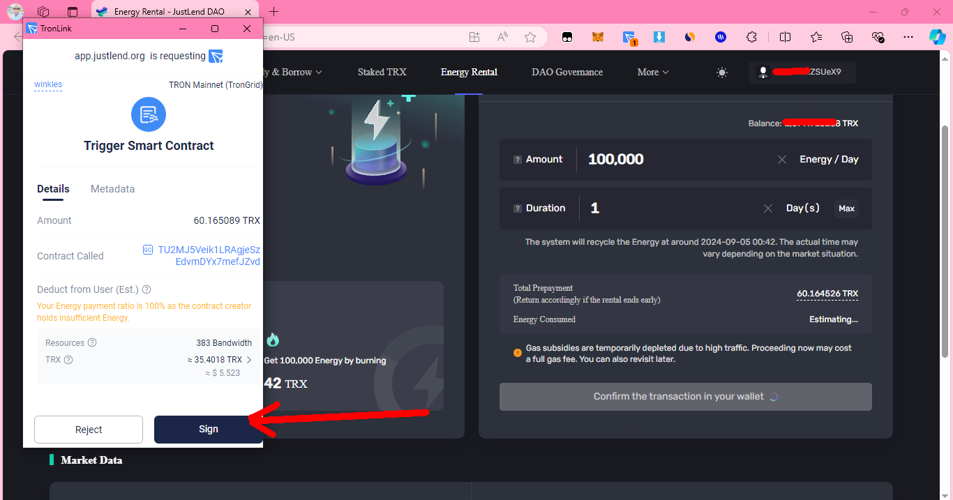 ✔এরপর 'RENT NOW' তে ক্লিক করলে আবার TronLink wallet ওপেন হবে এবং আপনাকে sign in করতে হবে।