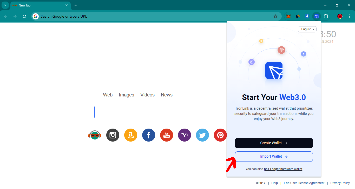 ✔ইনস্টল এর পরে আপনার যদি TronLink wallet না থাকে তাহলে নতুন করে create wallet এ ক্লিক করে নতুন একটি ওয়ালেট তৈরি করে নেবেন। আর যদি আগে থেকে আপনার TronLink wallet থেকে থাকে তাহলে ইম্পোর্ট ওয়ালেট এ ক্লিক করে ইম্পোর্ট করে নিলেই হয়ে যাবে। আমার যেহেতু ওয়ালেট আছে তাই ইম্পোর্ট ওয়ালেট এ ক্লিক করে দেখলাম।