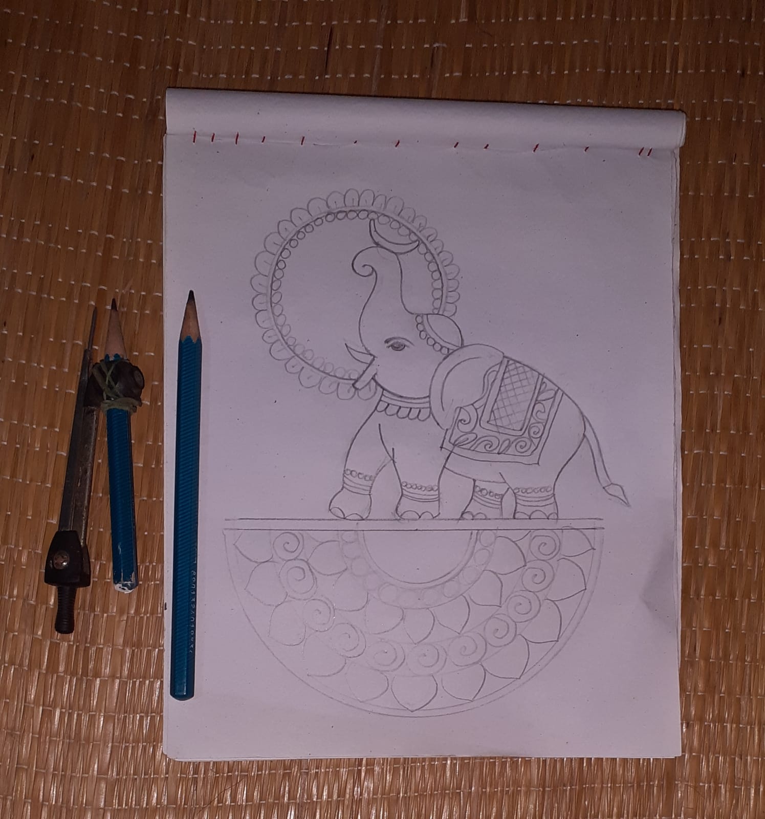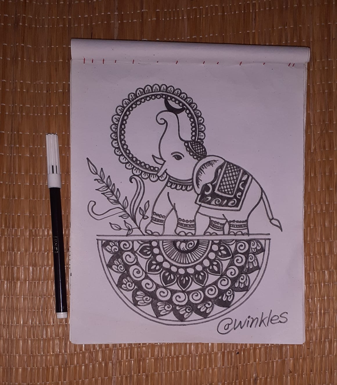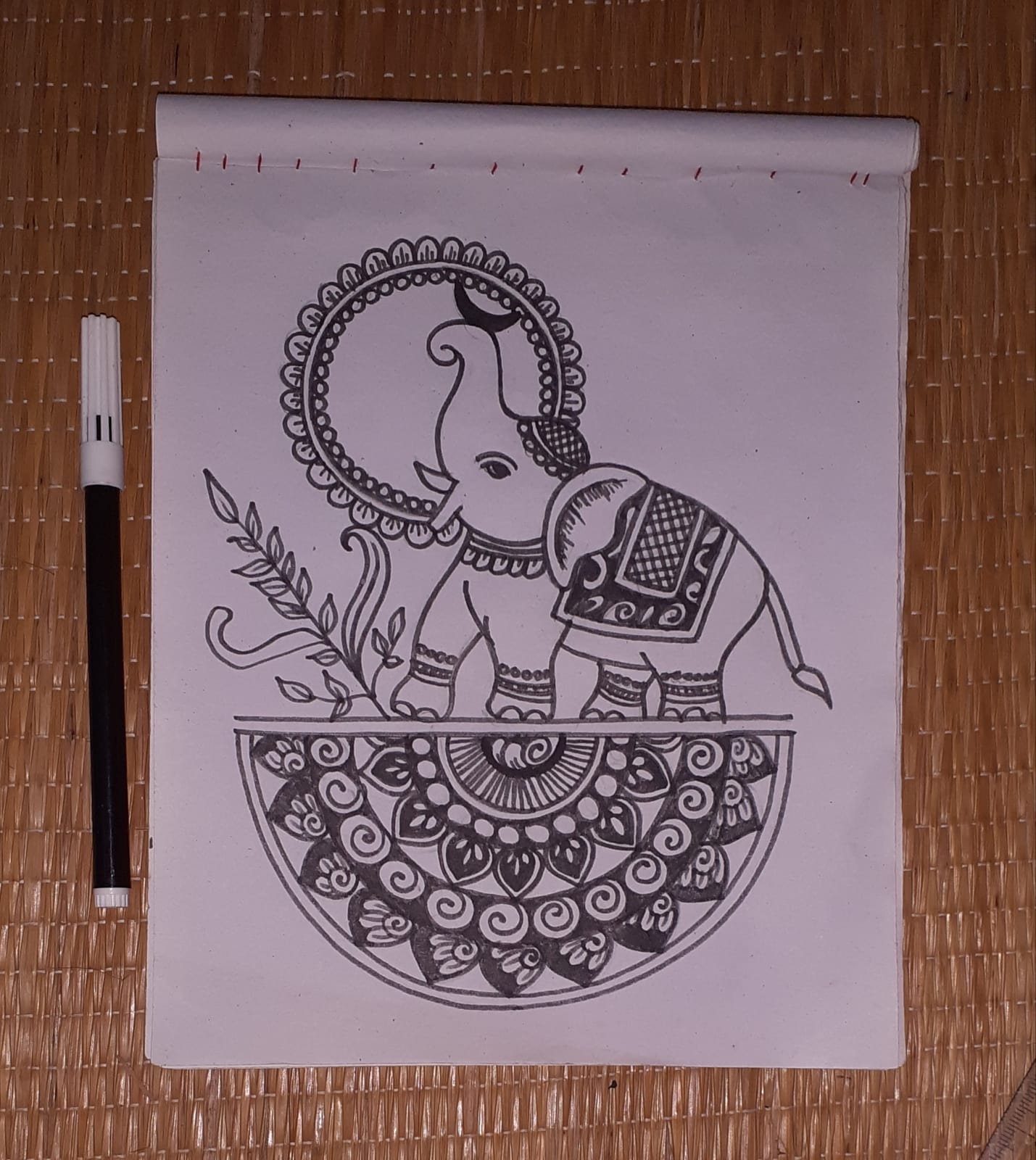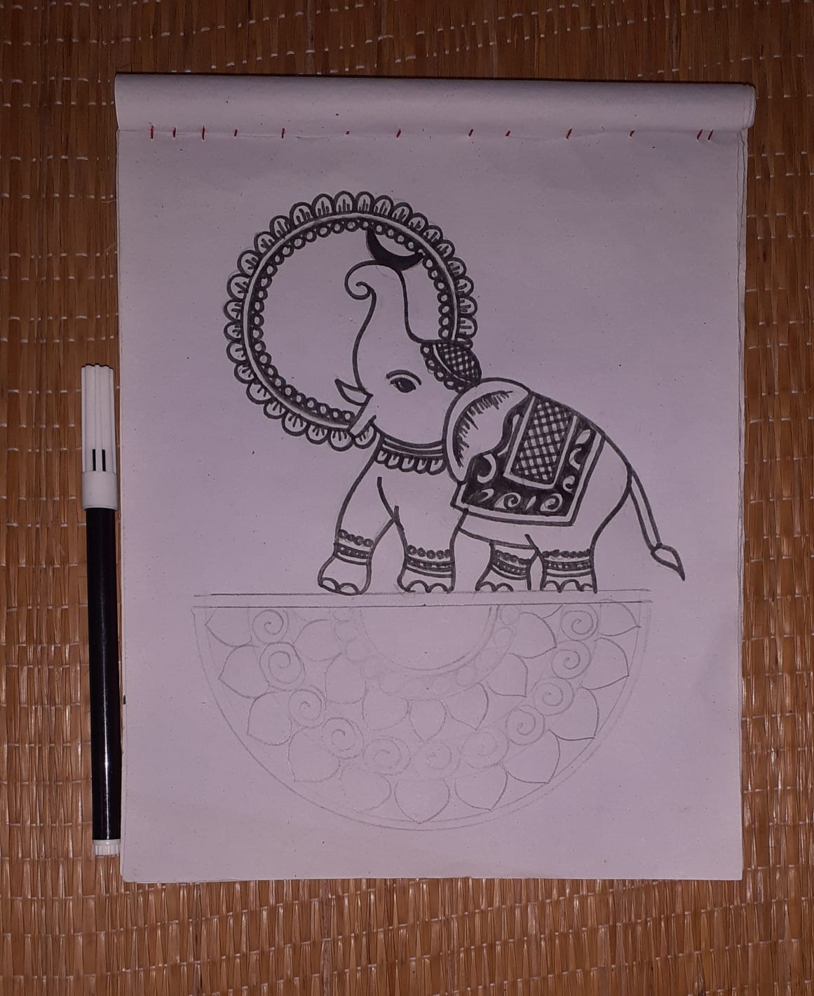 ▶️চতুর্থ ধাপে- হাতির পায়ের নিচে যে অর্ধ বৃত্তাকার ম্যান্ডেলার ডিজাইন করেছিলাম, তাতে কালী করে দিয়েছিলাম। এরপর একটা ছোটোখাটো ডিজাইন এঁকে অঙ্কনটি এখানেই সমাপ্ত করেছিলাম।