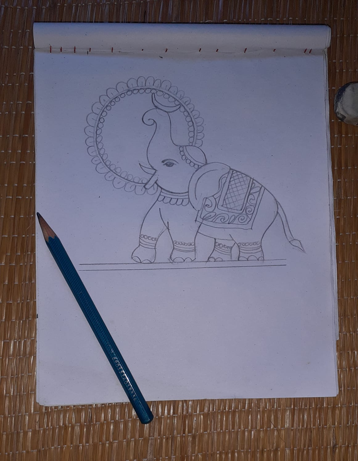 ▶️প্রথম ধাপে- স্কেচ পেন্সিল দিয়ে একটি সম্পূর্ণ হাতির দৃশ্য এঁকে নিয়েছিলাম। এরপর শুঁড়ের ওখানে একটি বৃত্তাকারে ম্যান্ডেলার ডিজাইন করে নিয়েছিলাম