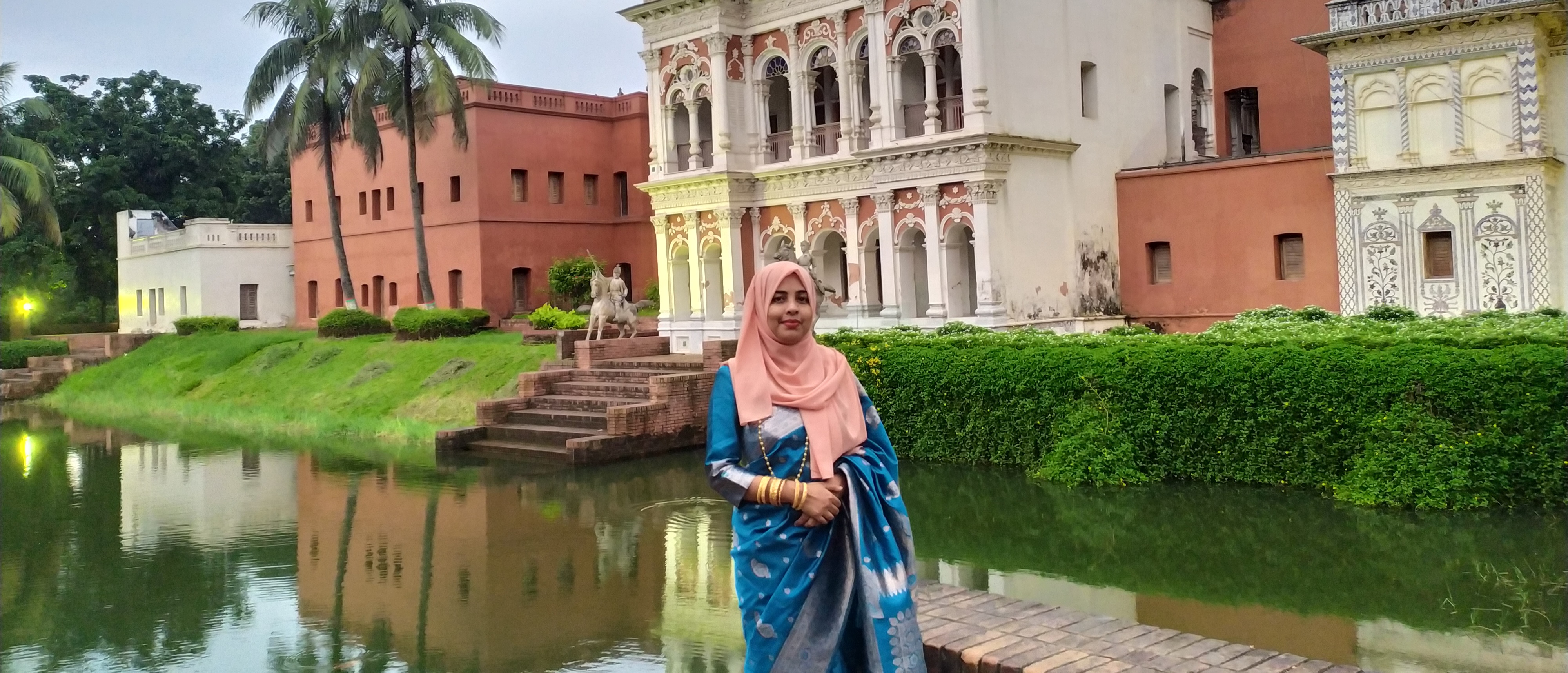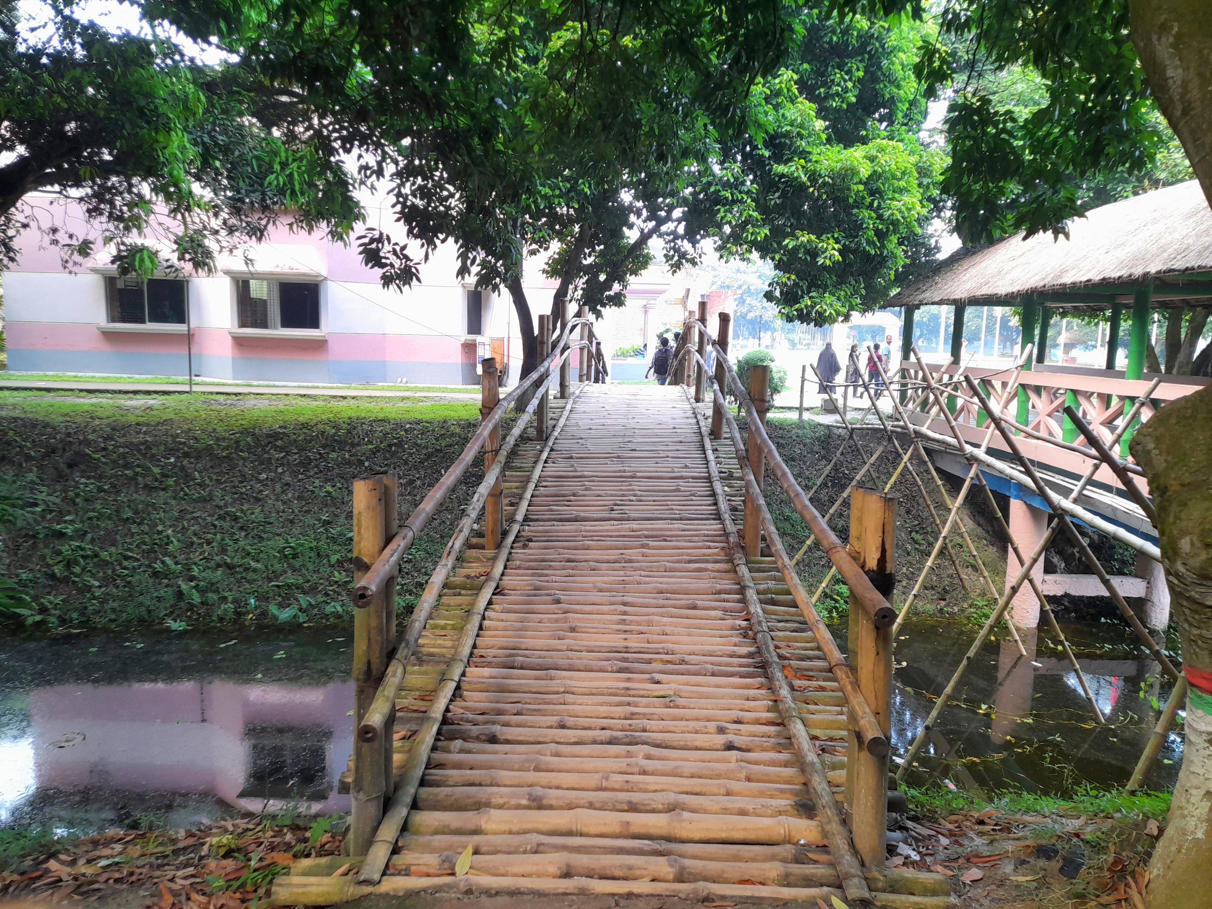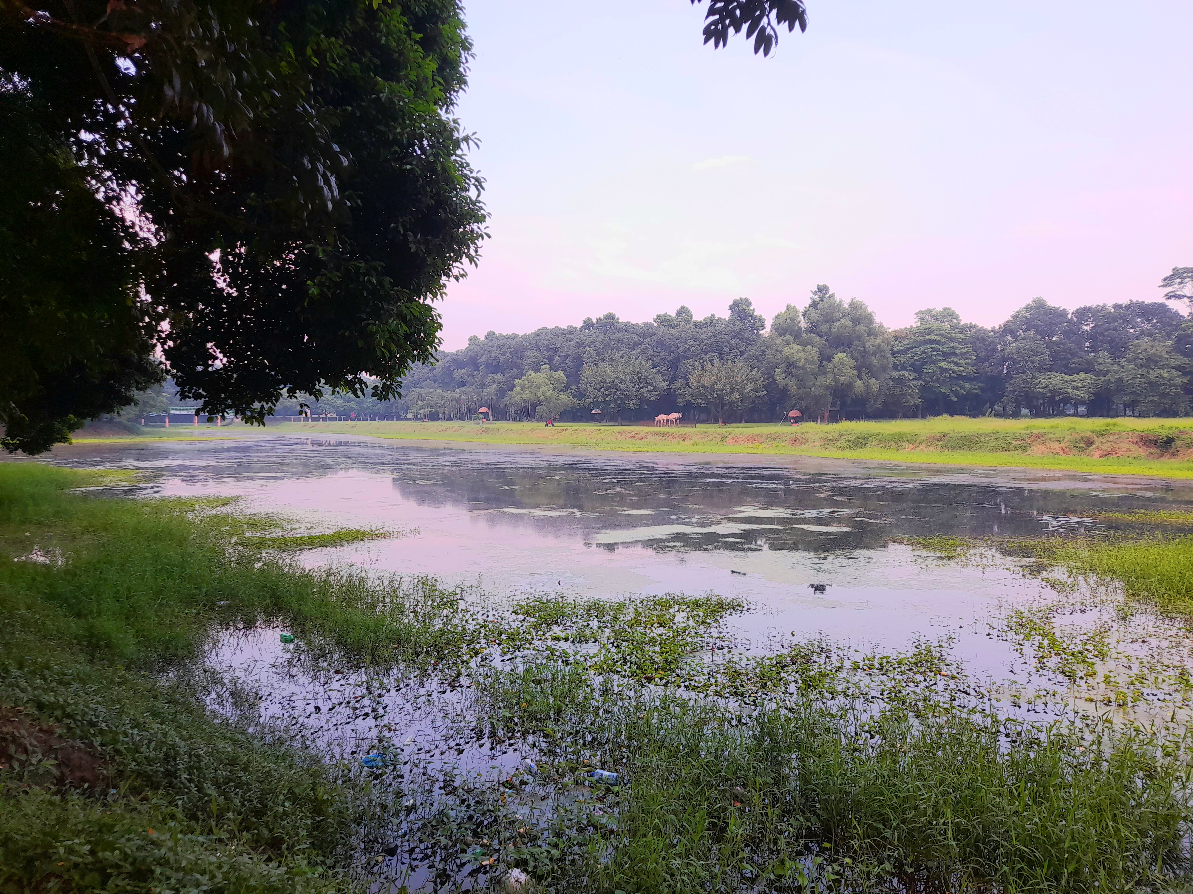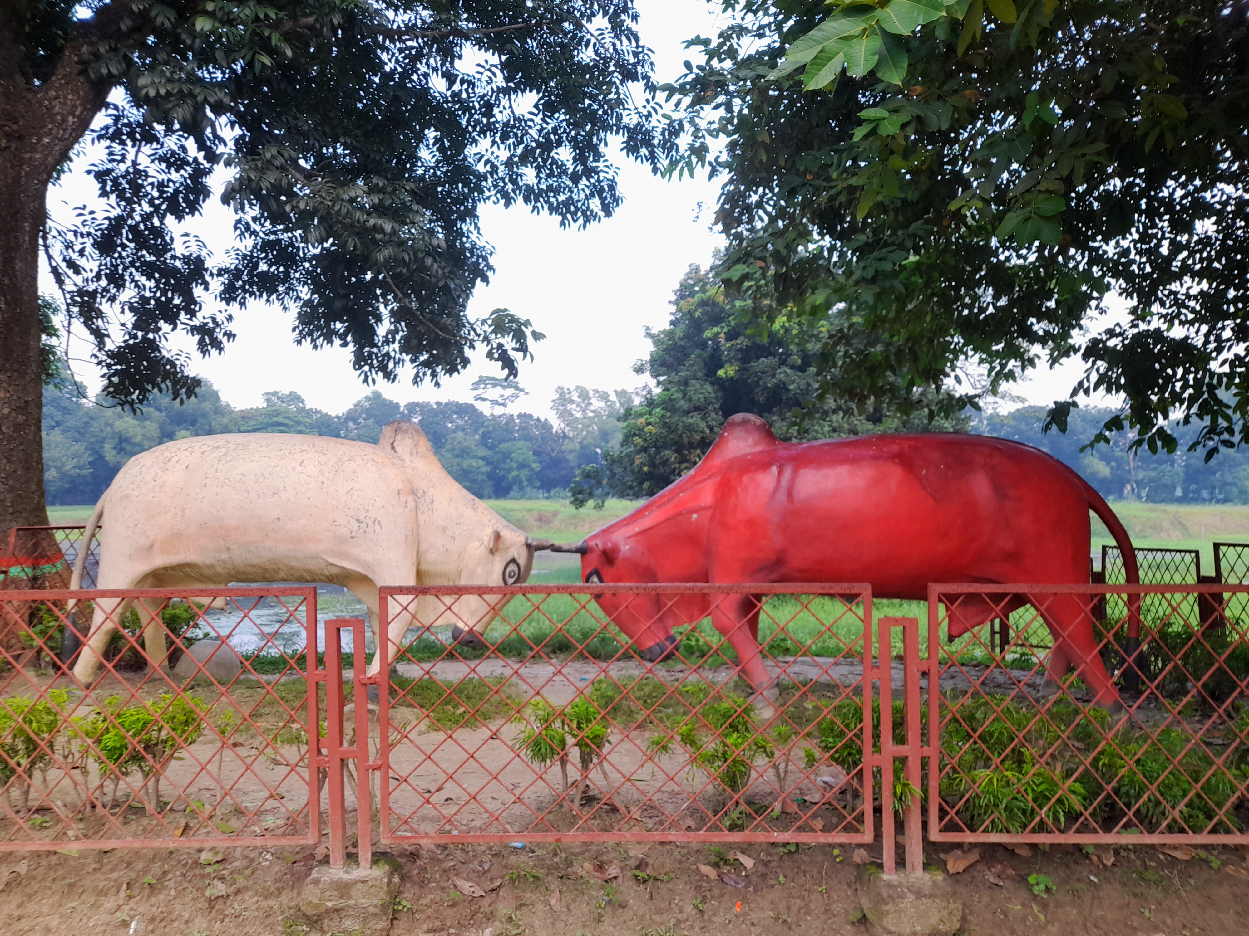 Upon reaching there, I was first captivated by the green landscape, calm water and some decorations. It felt like the smell of nature was embracing me. Then I slowly walked towards the lake and had a great experience. I was a little scared to cross the bridge made of bamboo but it was also a great feeling. The first time I went here, after going there, I stood under a flower tree and collected the flowers that were falling down. Then there was a sculpture showing two cows fighting with horns, one cow is red and the other is white. Then I sat on a bench there and enjoyed the natural beauty.