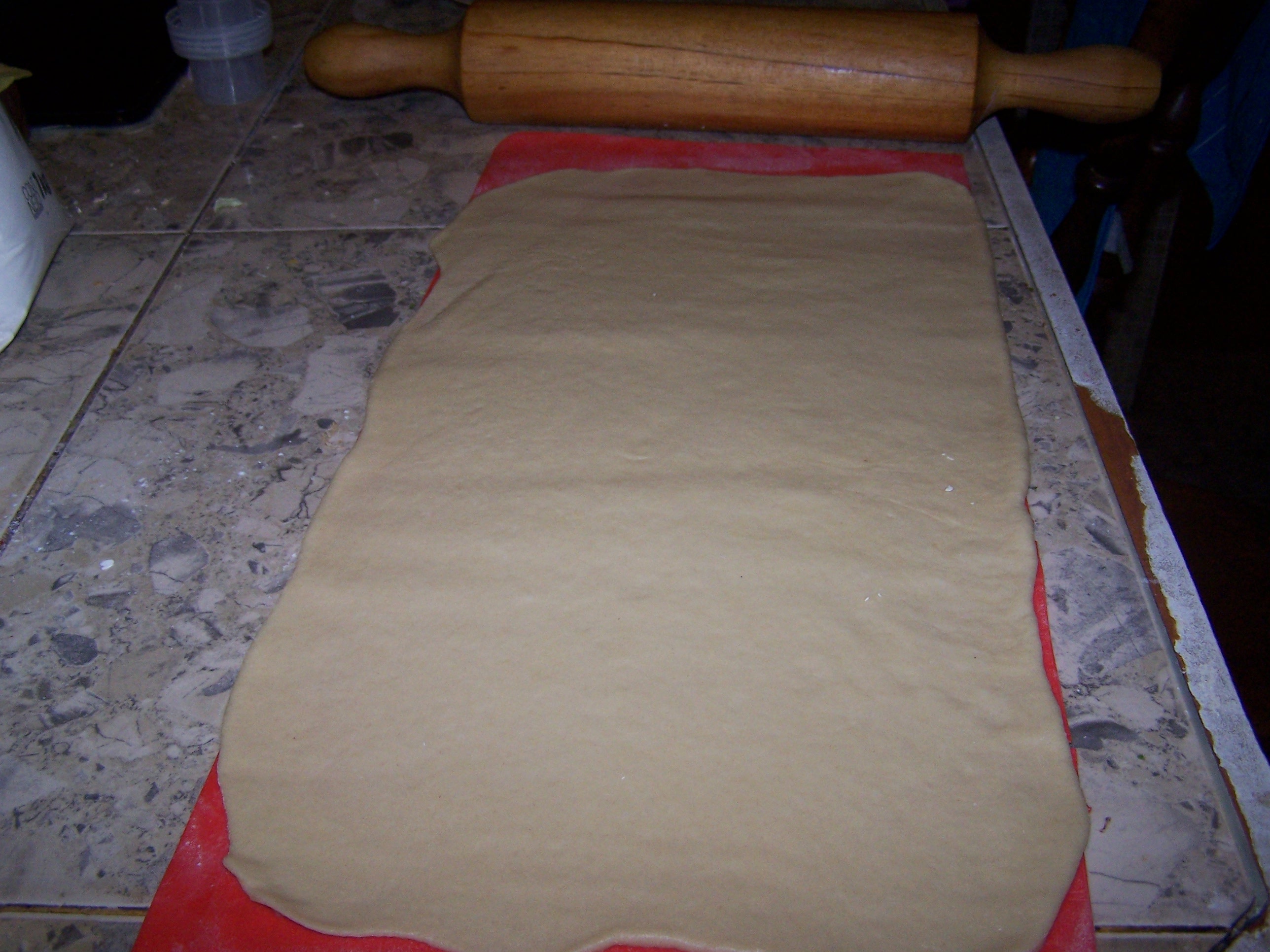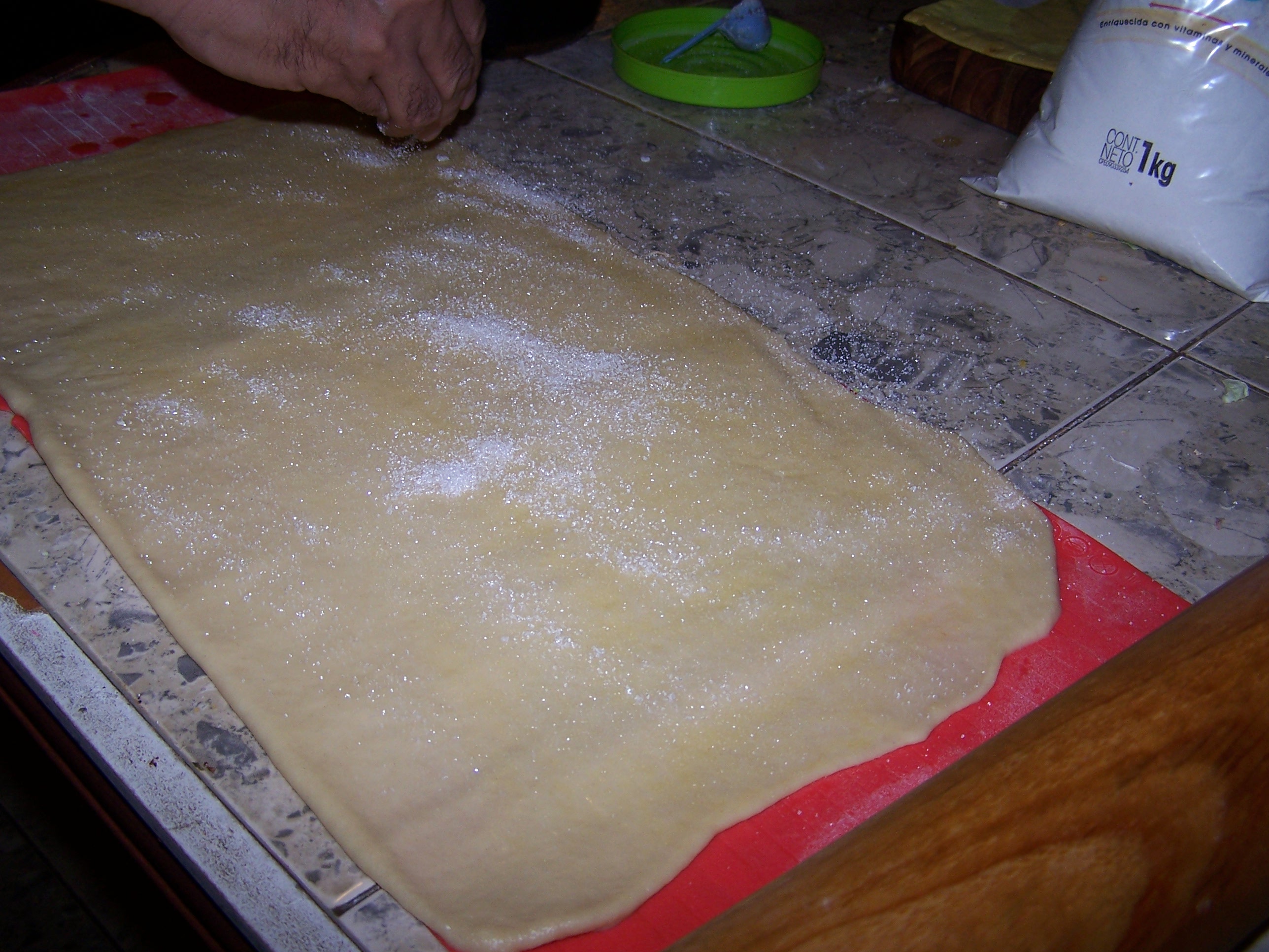 Una vez que la masa alcanzo el doble de su tamaño original, es el momento de estirarla hasta obtener un rectángulo de aproximadamente ½ cm de espesor.