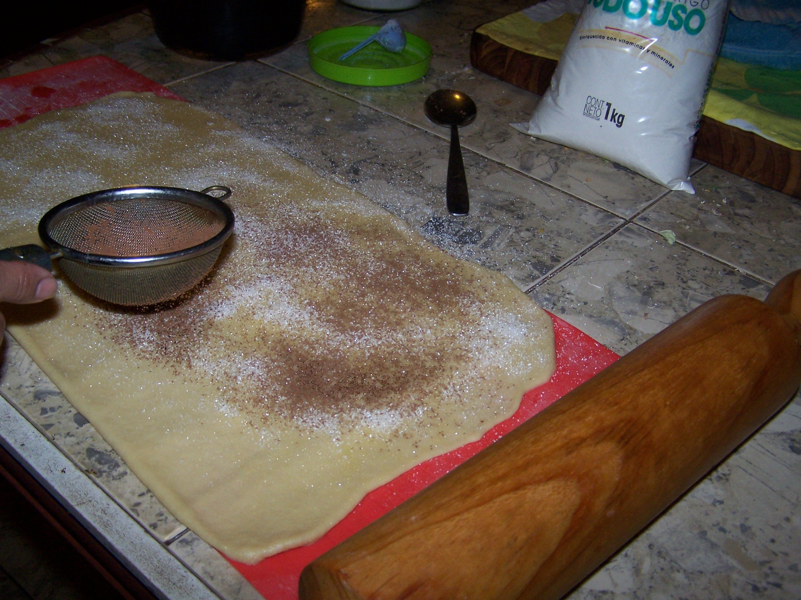 Luego espolvoreamos los 20grs de azúcar encima de la masa y hacemos lo mismos con los 20 gramos de chocolate o cacao en polvo, con este último nos ayudamos con un colador pequeño.