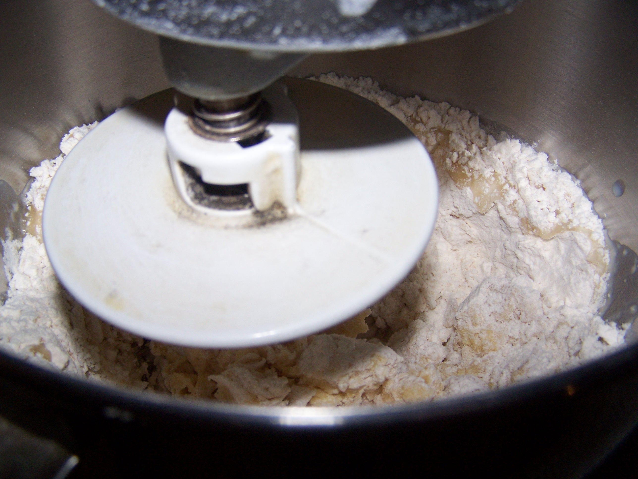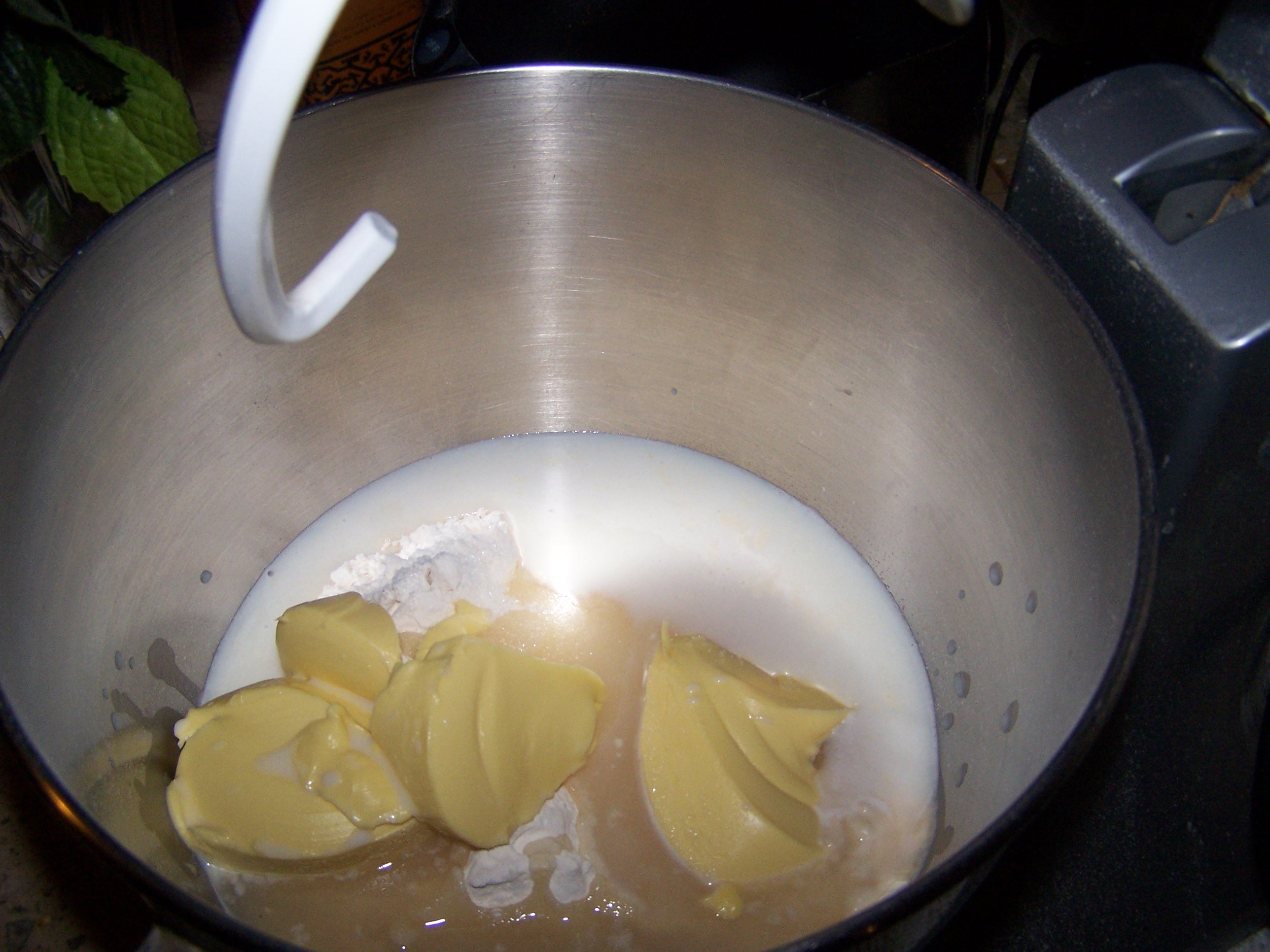 Cuando la levadura este lista, mezclamos en el bol de la batidora la harina de trigo, la margarina, el azúcar, la sal y la leche, y la encendemos para que se integren los ingredientes.
