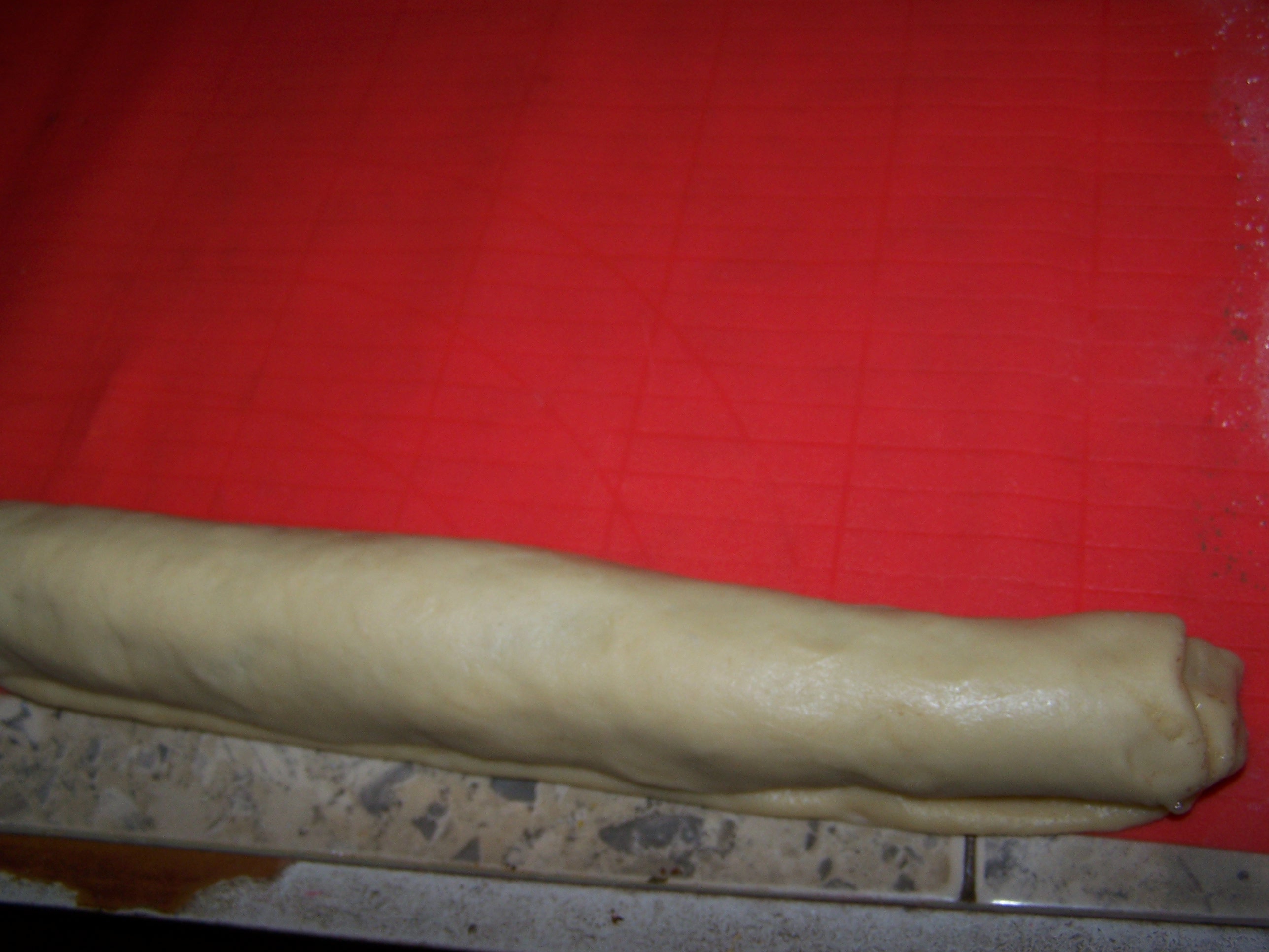 Ya el relleno del rol está listo, ahora es el momento de enrollar la masa, obtendremos un largo cilindro.