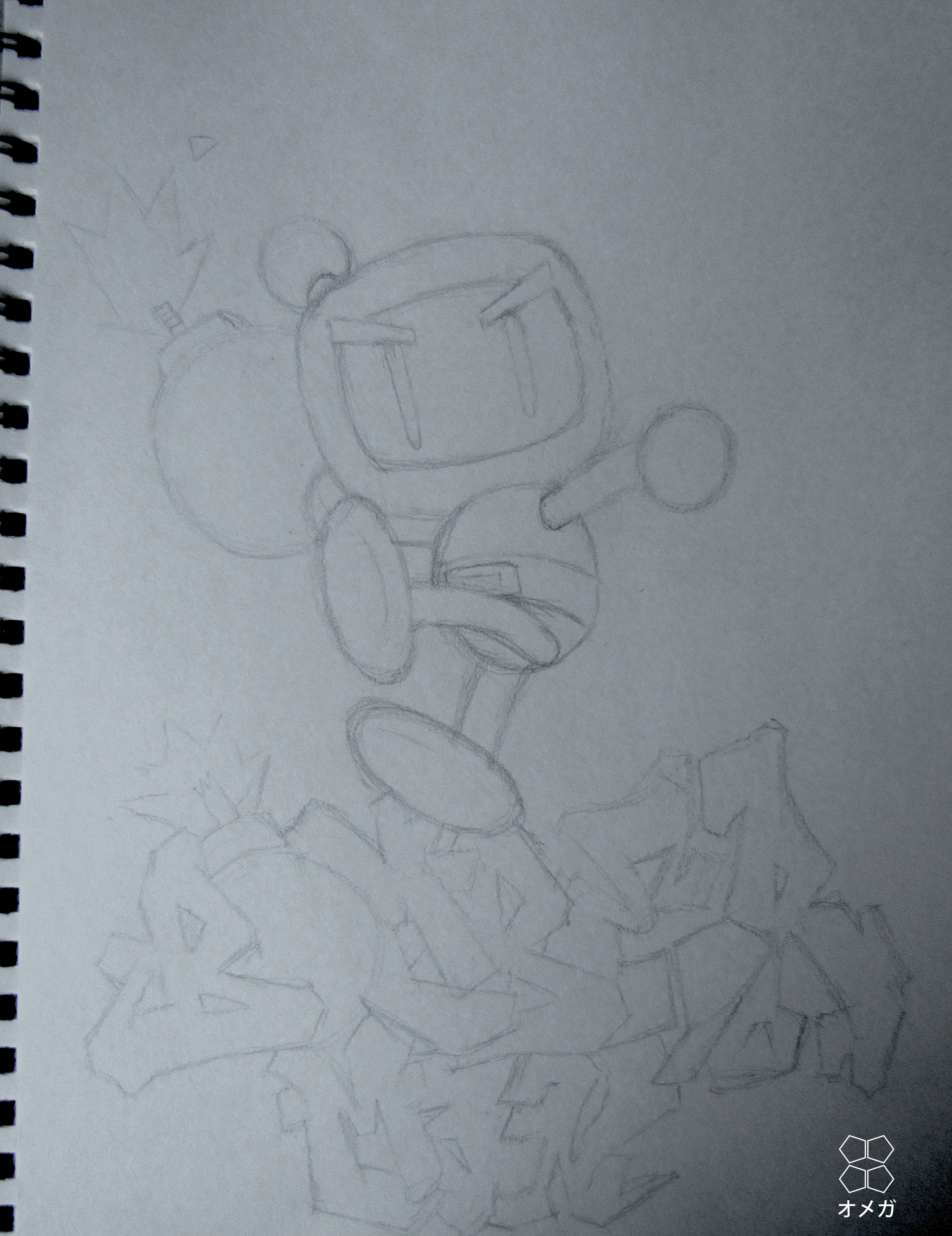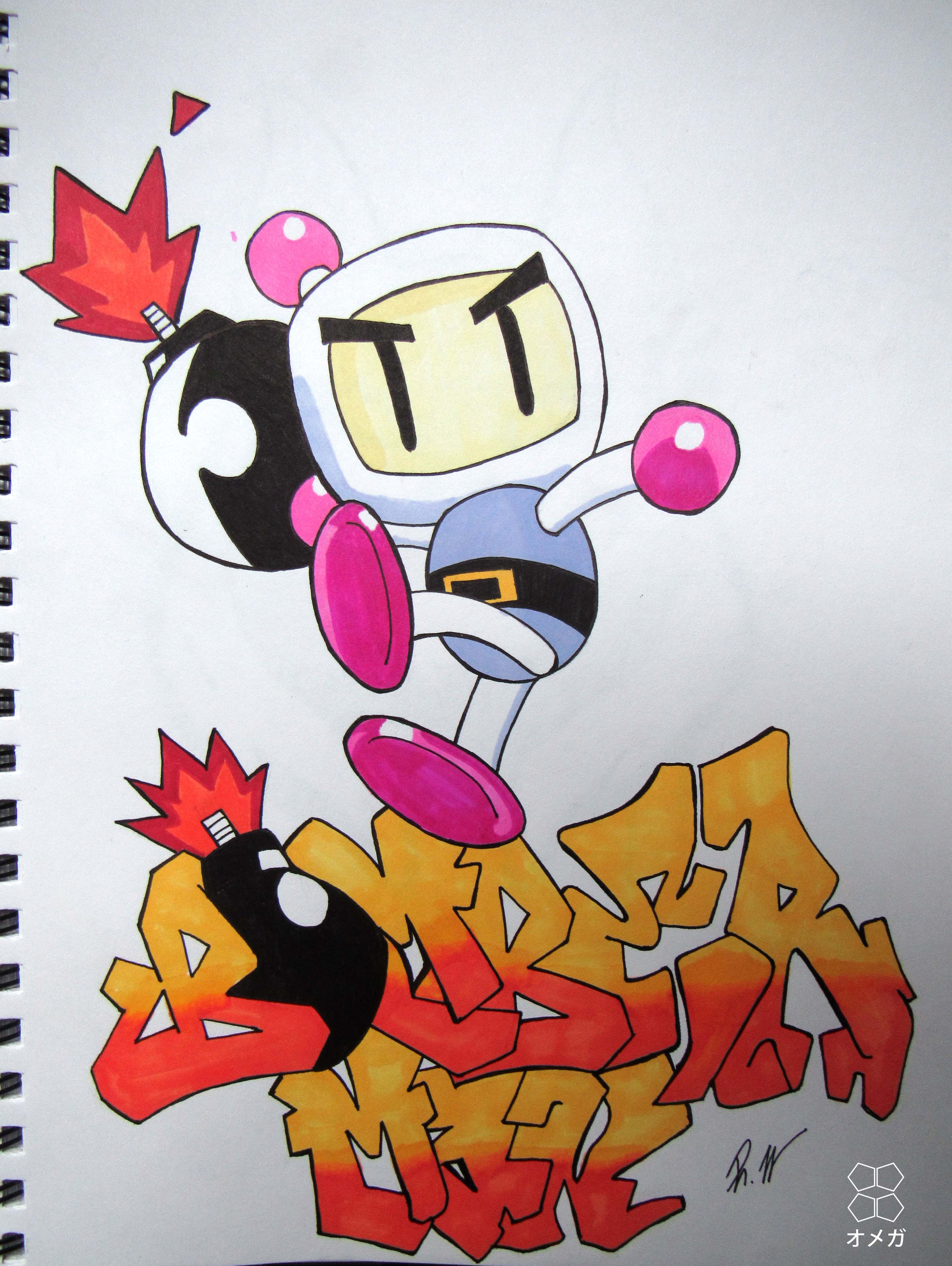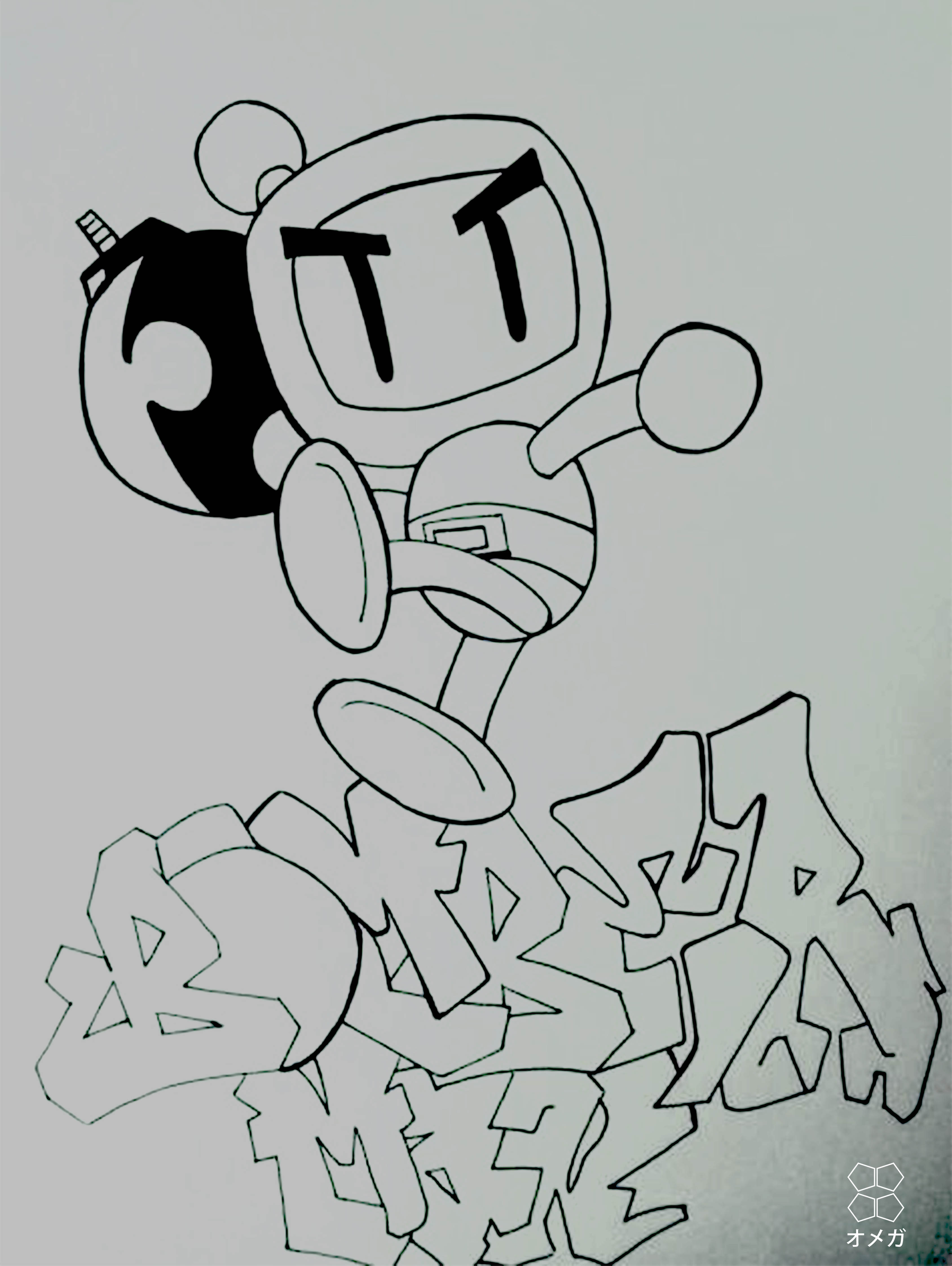 I tried to have a super steady hand when I'm putting down the ink, but it can get tricky and I found myself missing up at times. But, we must go on ʕ ▀ ਊ ▀ ʔ So I just thicken the lines a little more on Bomberman and the graffiti letters.