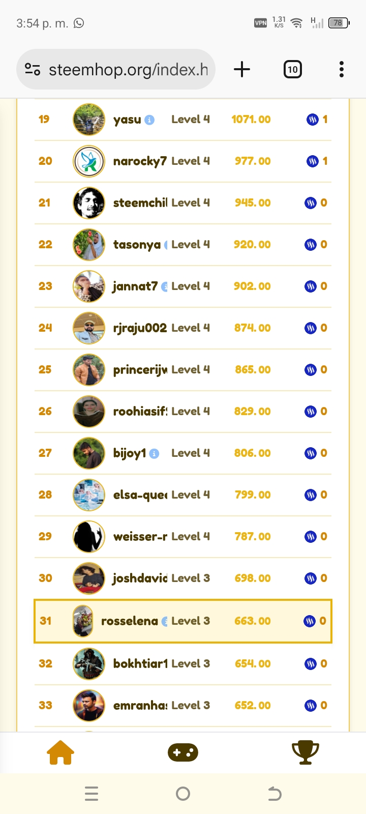 Termine está primera ronda y obtuve unos 663 puntos para ubicarme en el puesto número 31, ahora tendré que esforzarme más para seguir escalando posiciones y subir a lo nad alto del ranking semanal