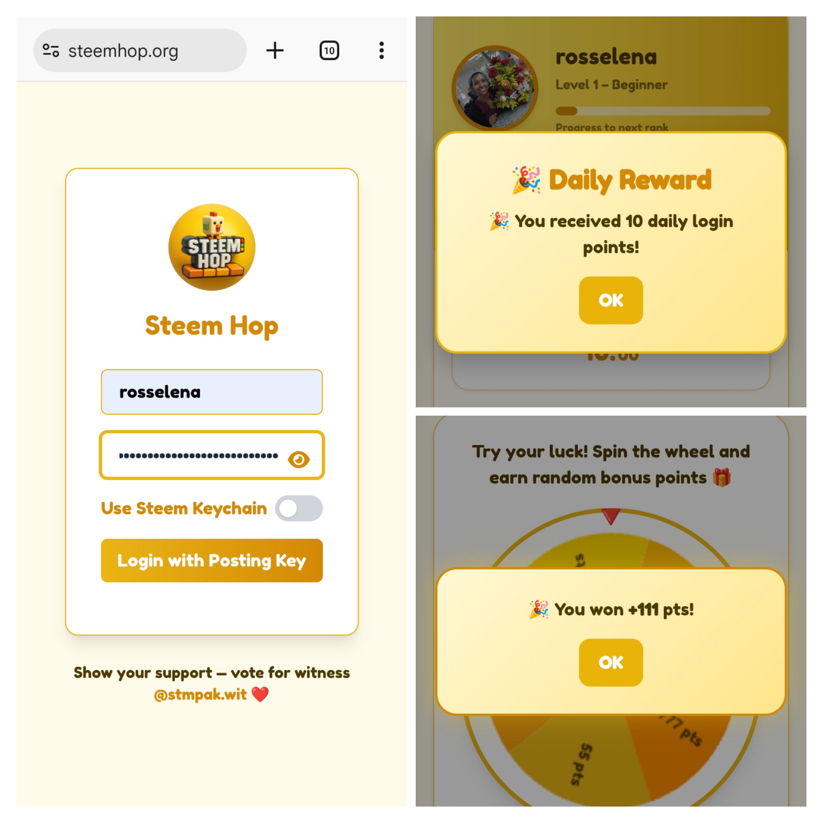 Como ya han de saber para iniciar el juego debemos colocar nuestro usuario de steem y la clave de publicación, y obtenemos 10 puntos solo por iniciar sesión y de una vez voy a girar la ruleta y obtuve 111 puntos en este primer día de juego, la semana pasada mi aventura no fue muy buena porque no logré ubicarme entre los ganadores espero está semana tener más suerte