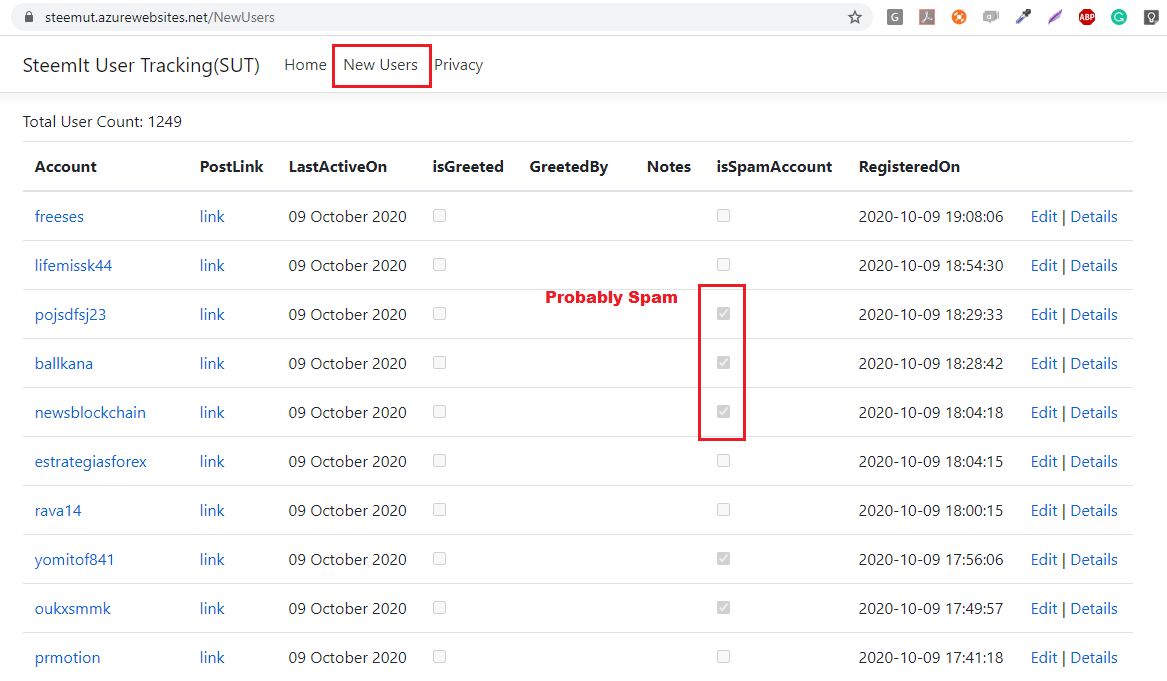 - Account, Post link, Last Active On, is Greeted, Greeted By, Notes, is Spam Account, Registered On details are being displayed.