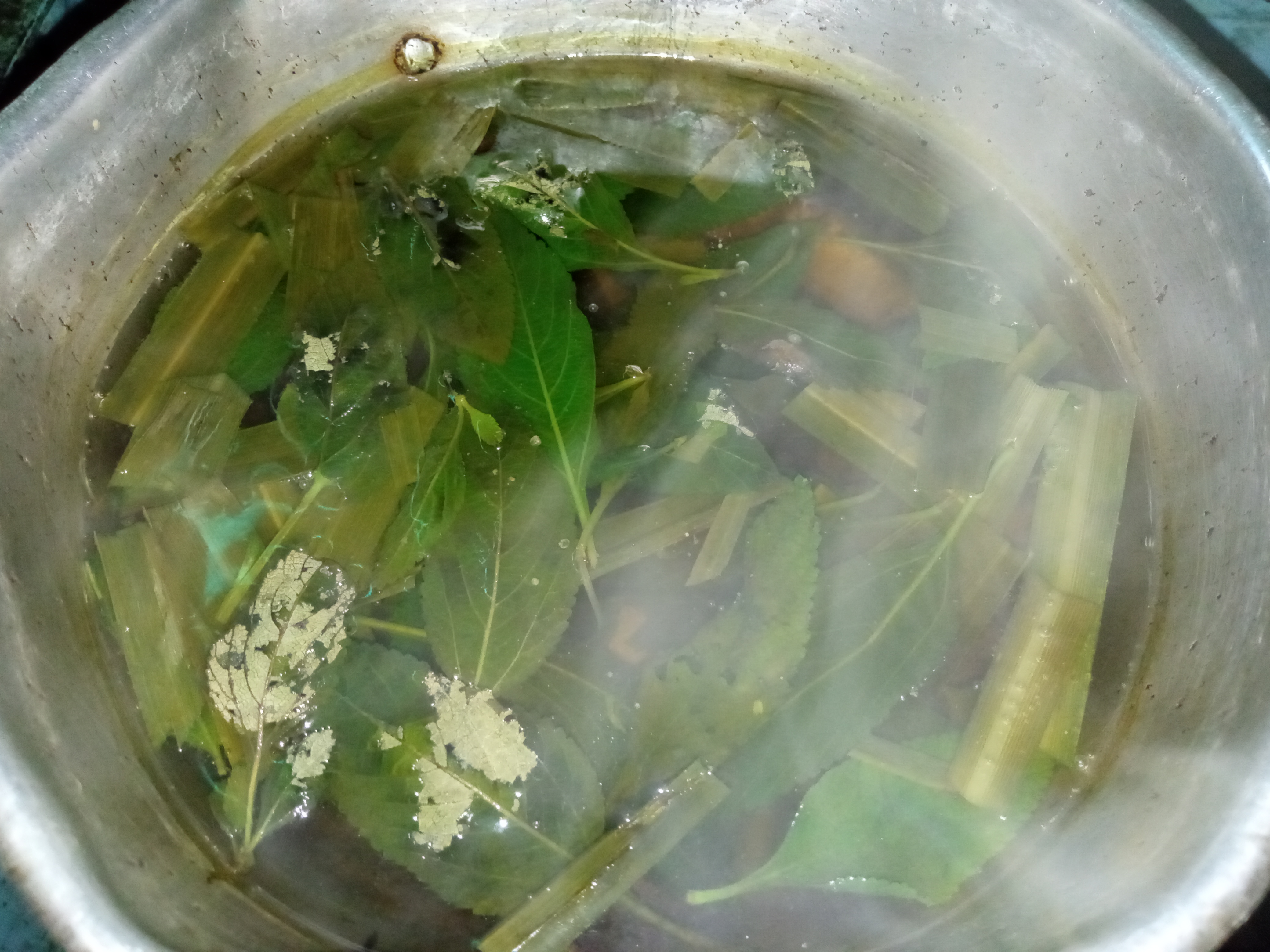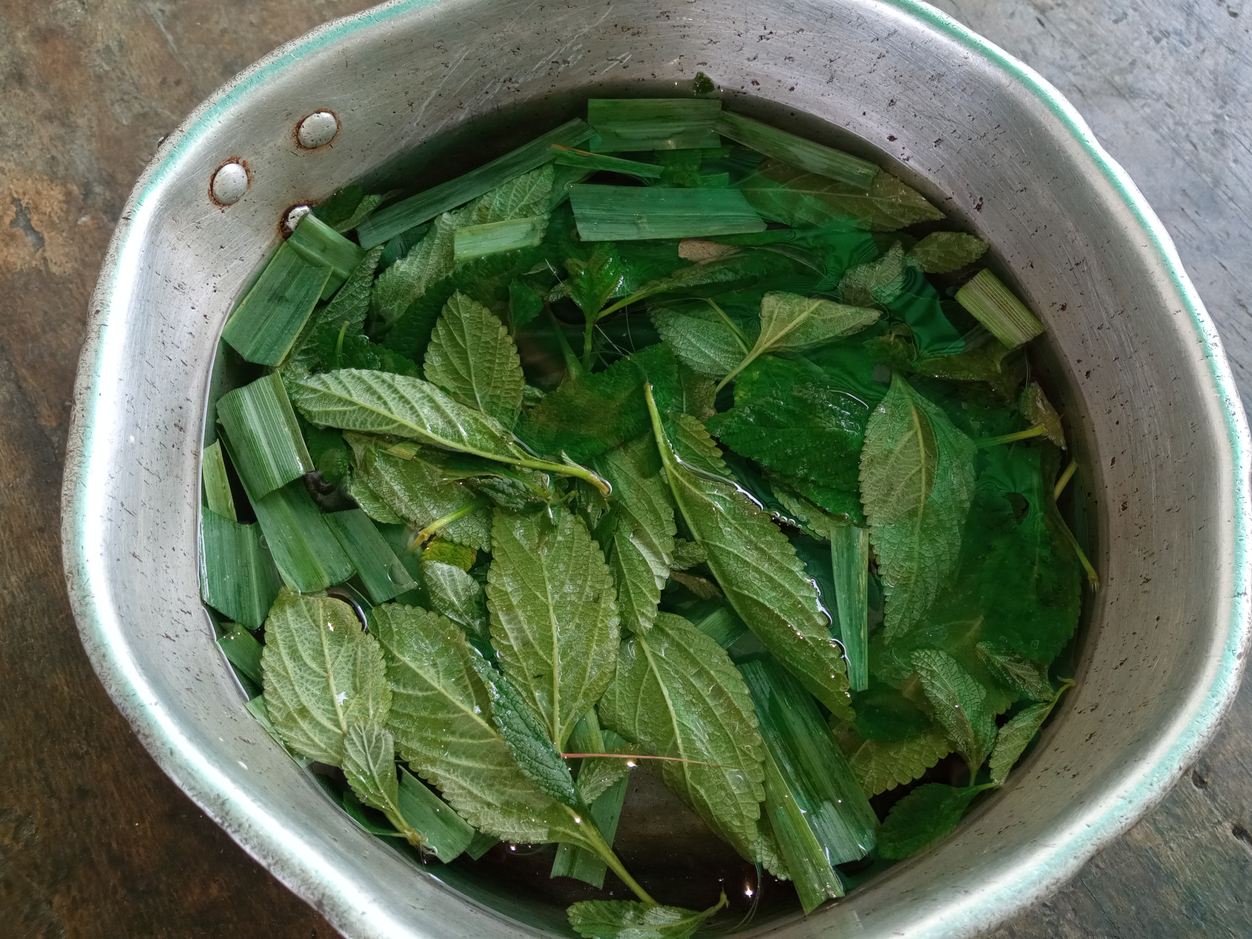 Primeramente lavamos las platas de poleo y malojillo con abundante agua, colocamos en una olla con agua para luego colocarla en la cocina a fuego medio.