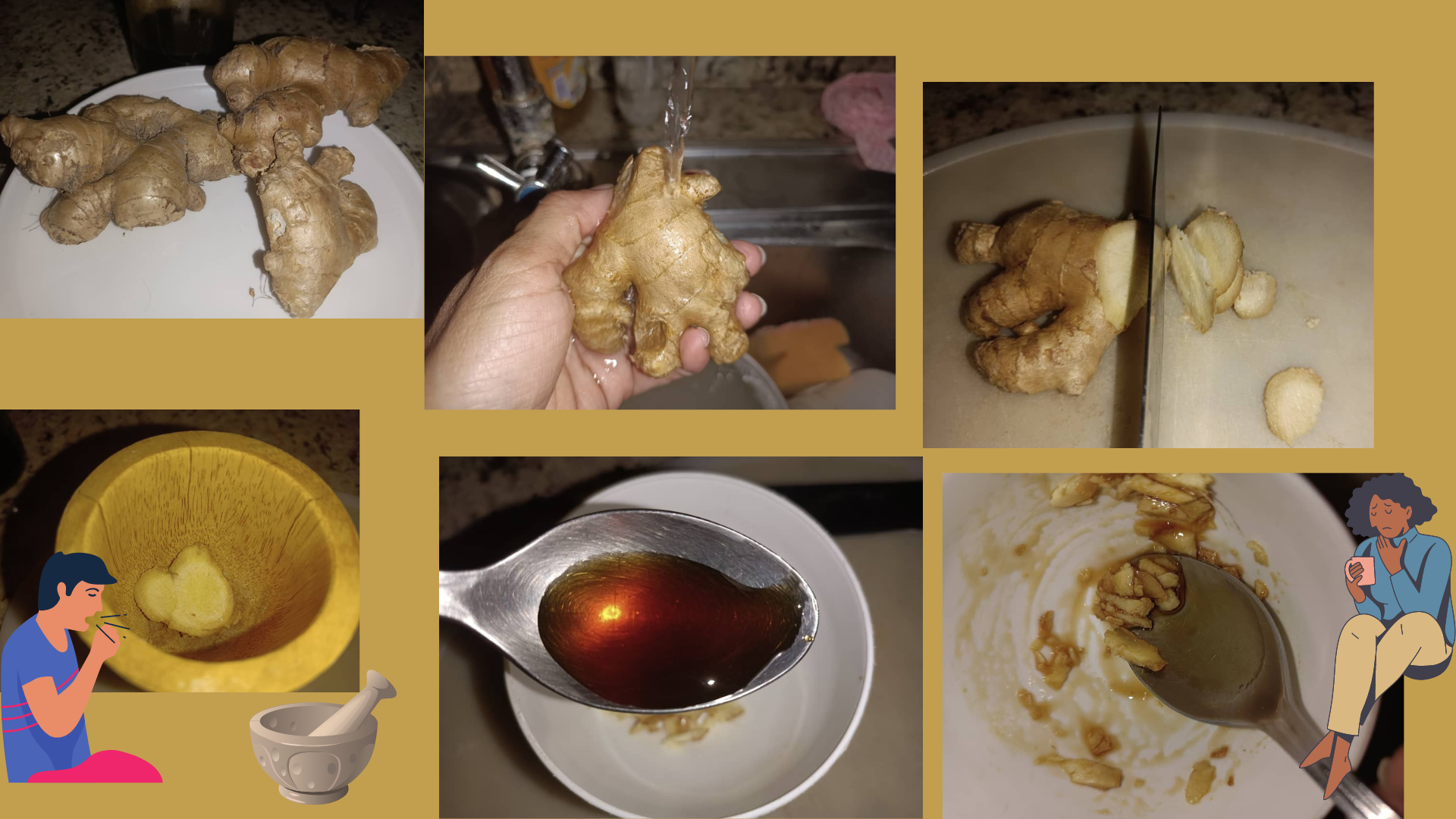 Tomo un trozo de jengibre y lo lavo bien, lo coloco sobre un tabla lo pico en trozos y lo llevo a un mortero a tritura para que salga bien su juguito le adiciona una cucharada de miel, y mezclo, me tomo una cucharadita de este preparado dos veces al día, generalmente en la mañana y en la noche por tres días mínimo, es muy efectivo amigos, se los recomiendo. Los trocitos de jengibre los masticos bien para repotenciar el efecto de esta medicina tradicional.