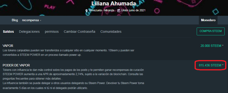 Luego del encendido mi cuenta quedo en 815.436 STEEM encendidos.