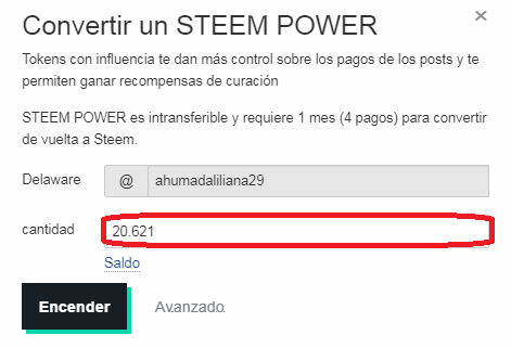 Comencé el proceso de encendido haciendo clic en mi saldo y luego seleccione la opción Power Up. Al abrirse el formulario para introducir la cantidad que deseaba encender, coloque 20.621 STEEM.
