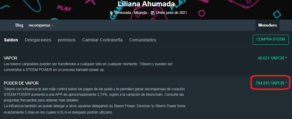Antes de iniciar el encendido, tenia un saldo de 794.815 Steem encendidos en mi billetera.