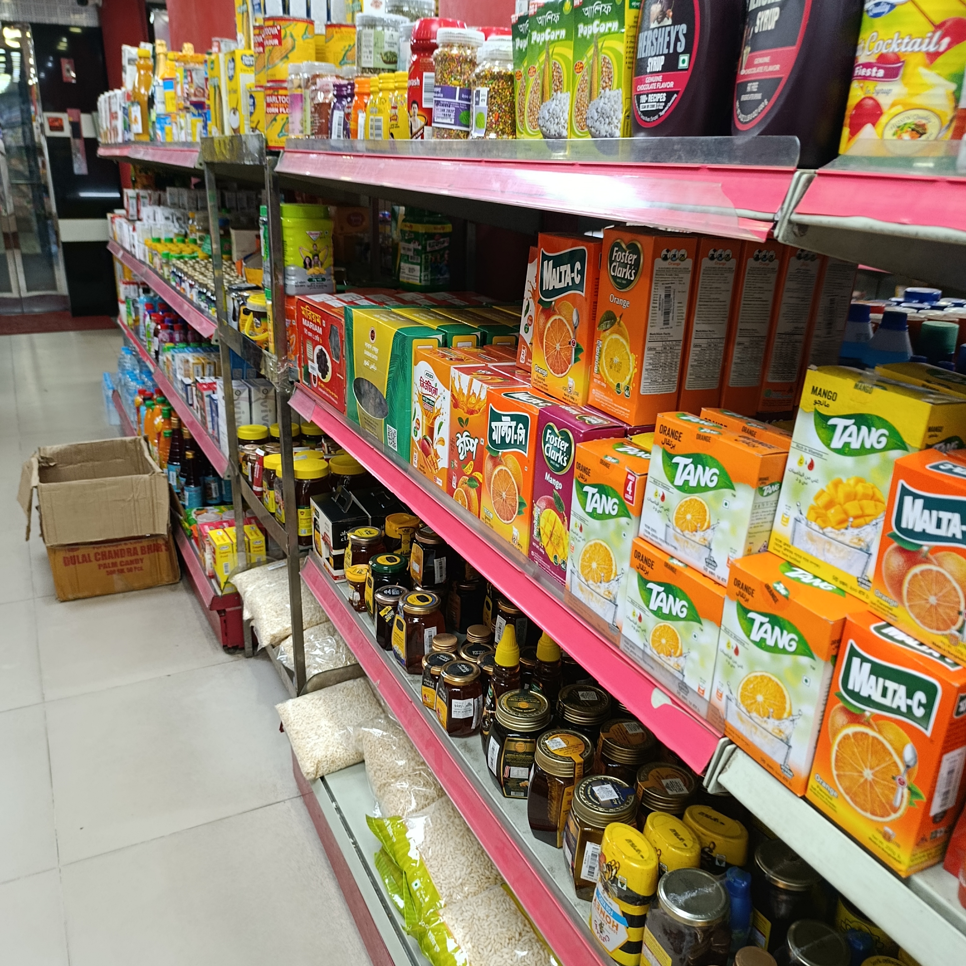 If I provide you with more information about the store, I would say that this store has around 10 to 12 employees, and each one assists every customer. Currently, there are some employees, along with several more. Some are occupied with cleaning and maintenance work, while others are busy arranging various products in their designated places. Let's look at some pictures to get more information, where we can see what other products are actually available. Before that, I should tell you that there is nothing here that cannot be found; for getting lentils in large quantities and various types of products, this is sufficient. Let's look at the pictures and see the names to know what is available here.