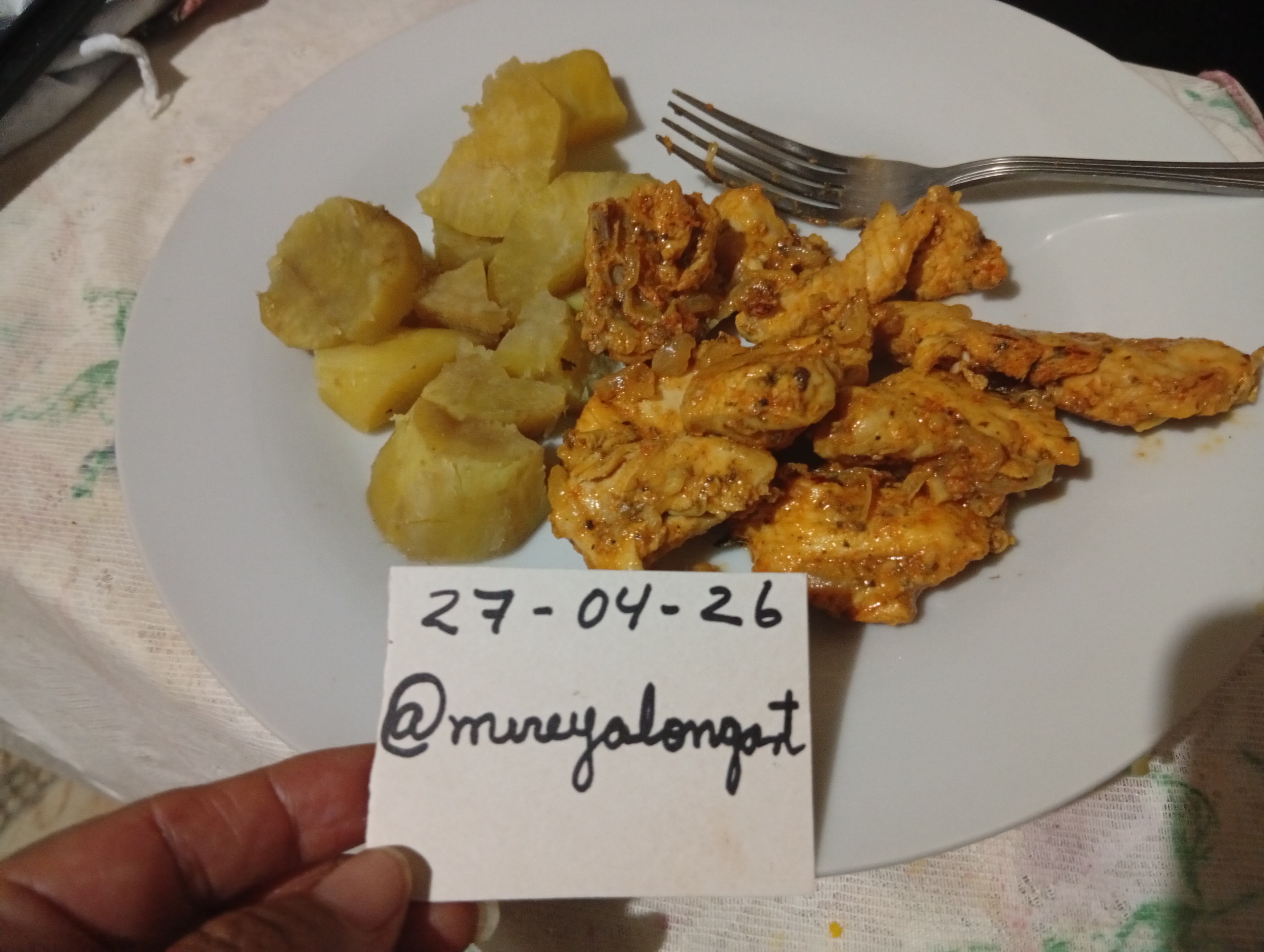 A la hora de la cena sancoche una batata pequeña para acompañar pollo que me había quedado del medio día lo calenté y lo servi en mi plato.