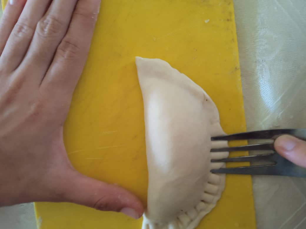 Luego busque las bolitas de masa y comencé hacer las empanadas con la ayuda de un tenedor para hacerle el sellado adecuado.