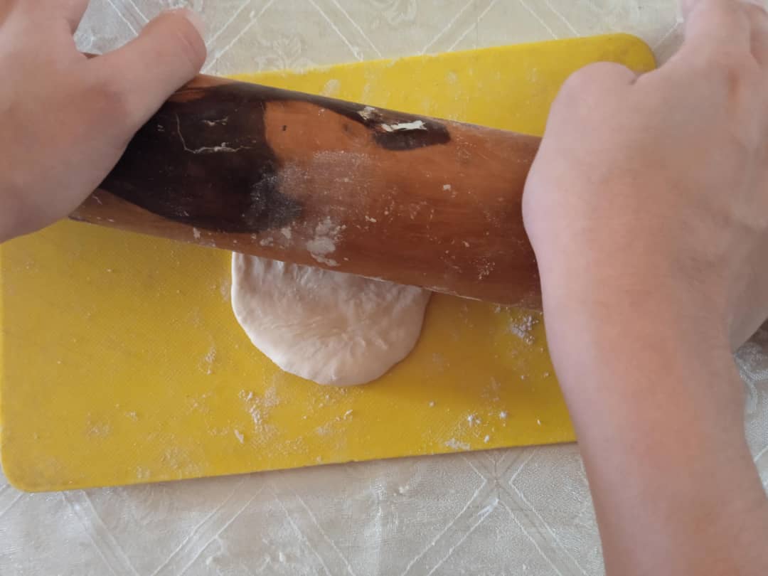 Pasado dicho tiempo se amasa un poco más para luego sacar unas cuantas bolitas y darle forma con el rodillo.