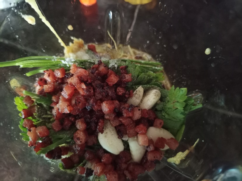 ✅ A la pulpa que está en la licuadora le vamos a agregar el perejil, ajo, la chuleta reservada, sal, pimienta y un chorrito de aceite. Vamos a licuar hasta obtener una mezcla homogénea. En caso de que este muy espesa y no se licue, añade más aceite o agua poco a poco.