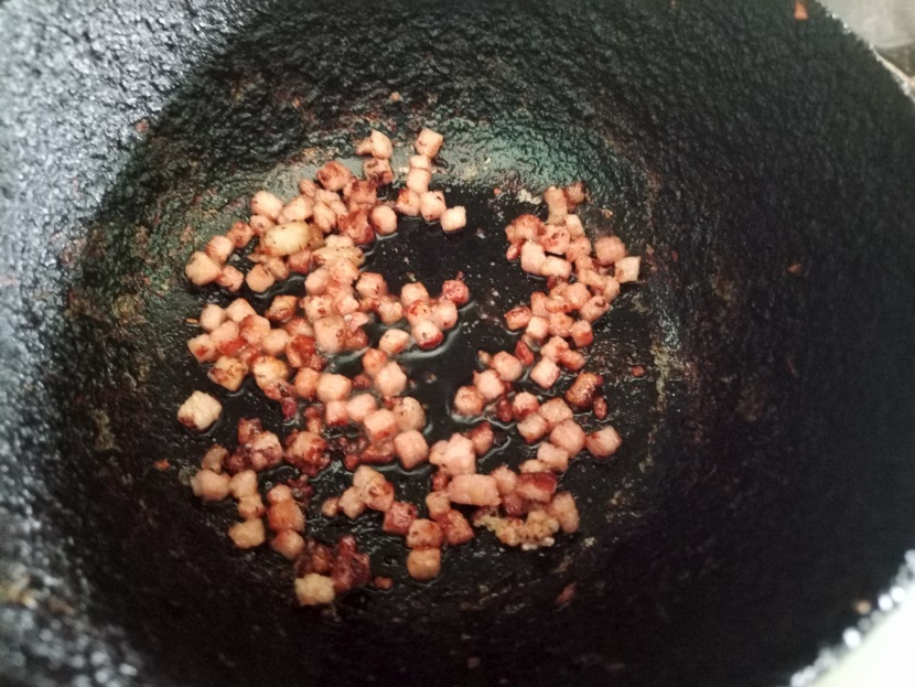 ✅ Mientras se cocinan las berenjenas, vamos a continuar con la chuleta ahumada. La vamos a cortar en cuadritos pequeños y vamos a cocinar hasta que estén doraditos y reservamos. Mientras mas chuleta agregue, mejor será el sabor.