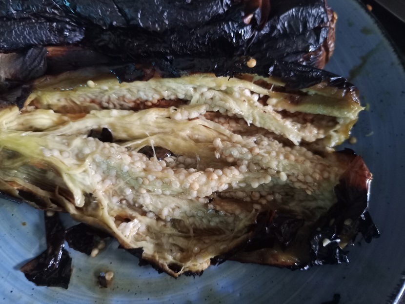 ✅ Dejamos enfriar las berenjenas, con un cuchillo abrimos y vamos a extraer la pulpa con una cuchara para agregarla en la licuadora. Esto se debe hacer un poquito de cuidado para evitar la concha.