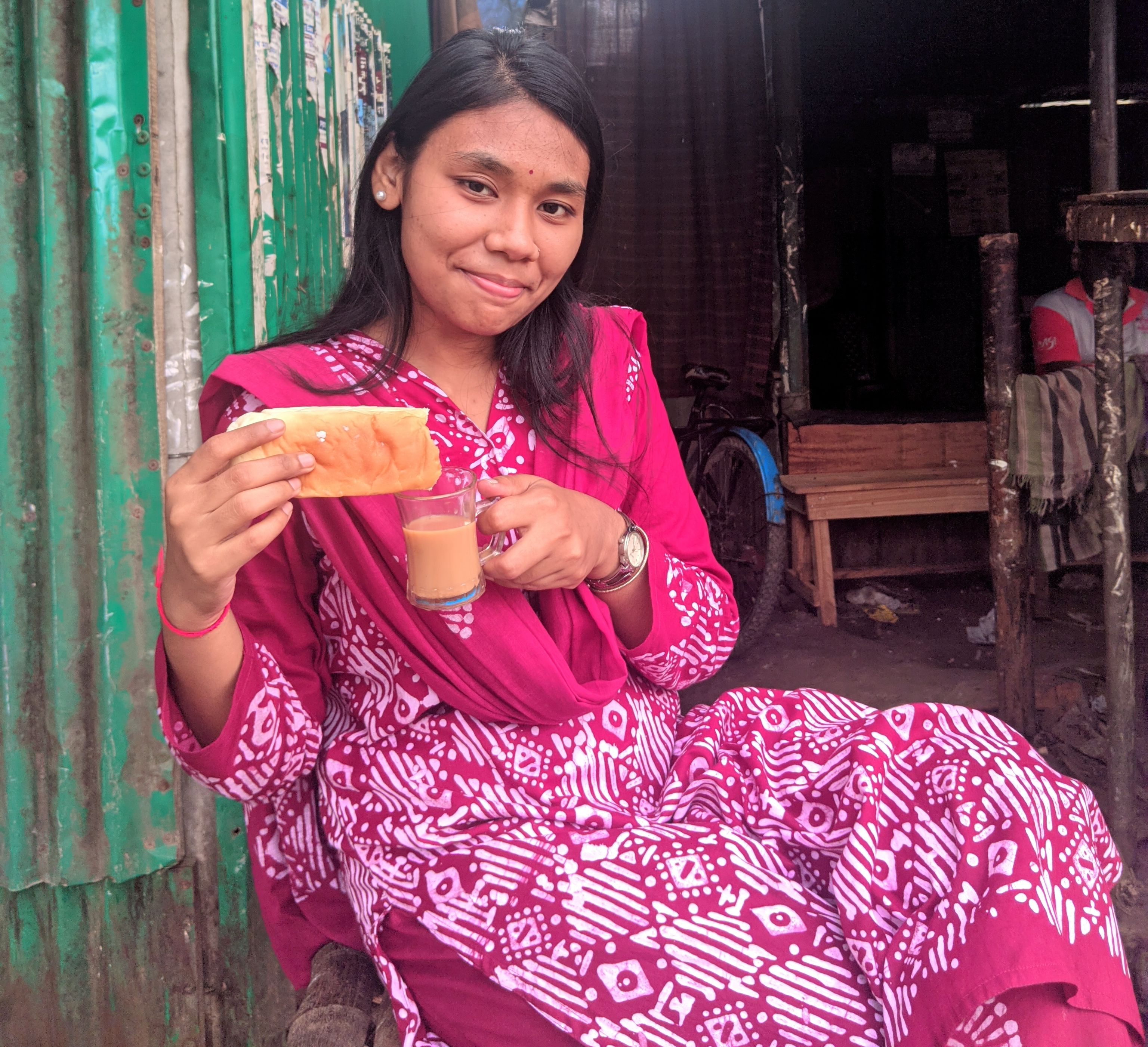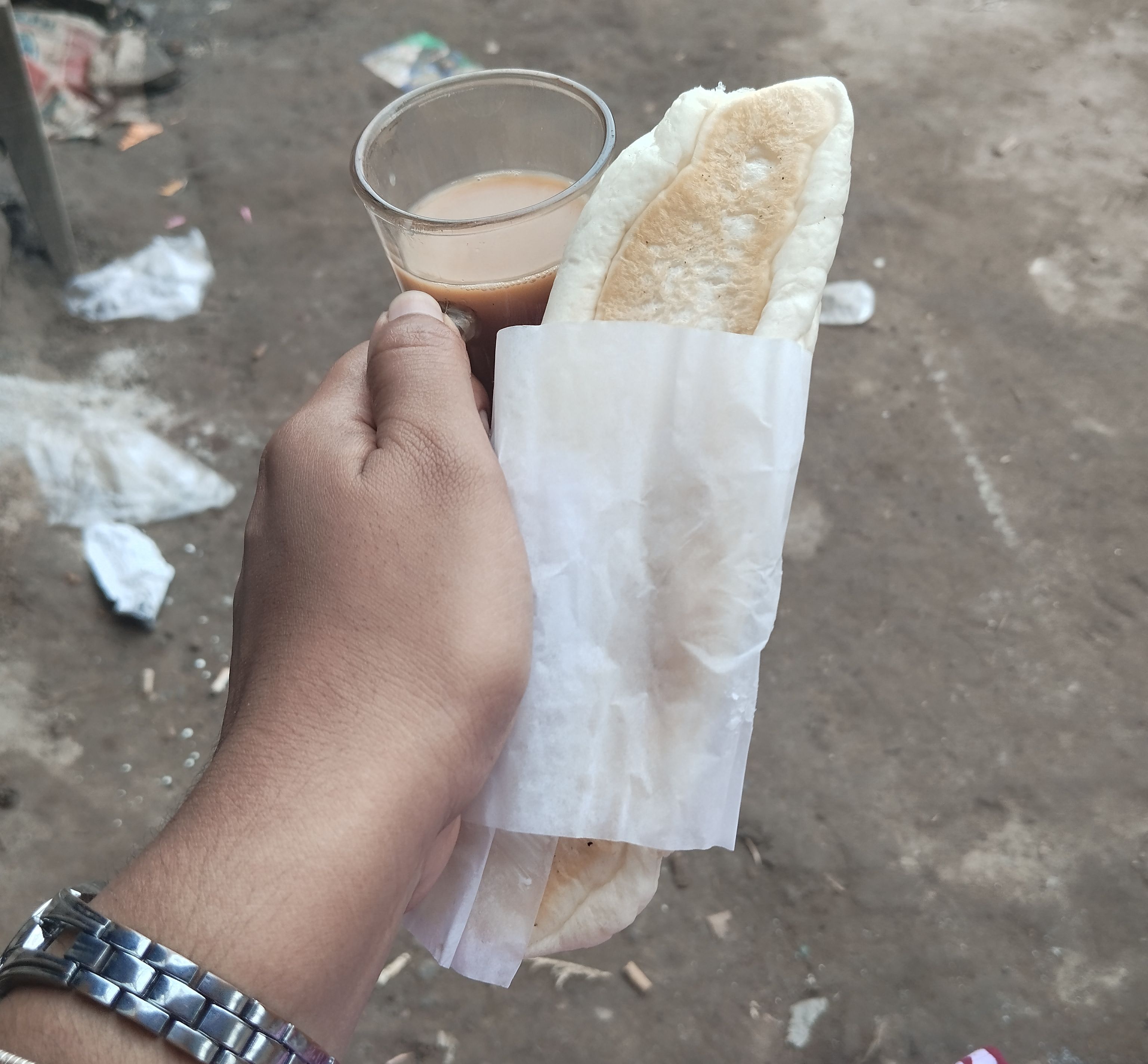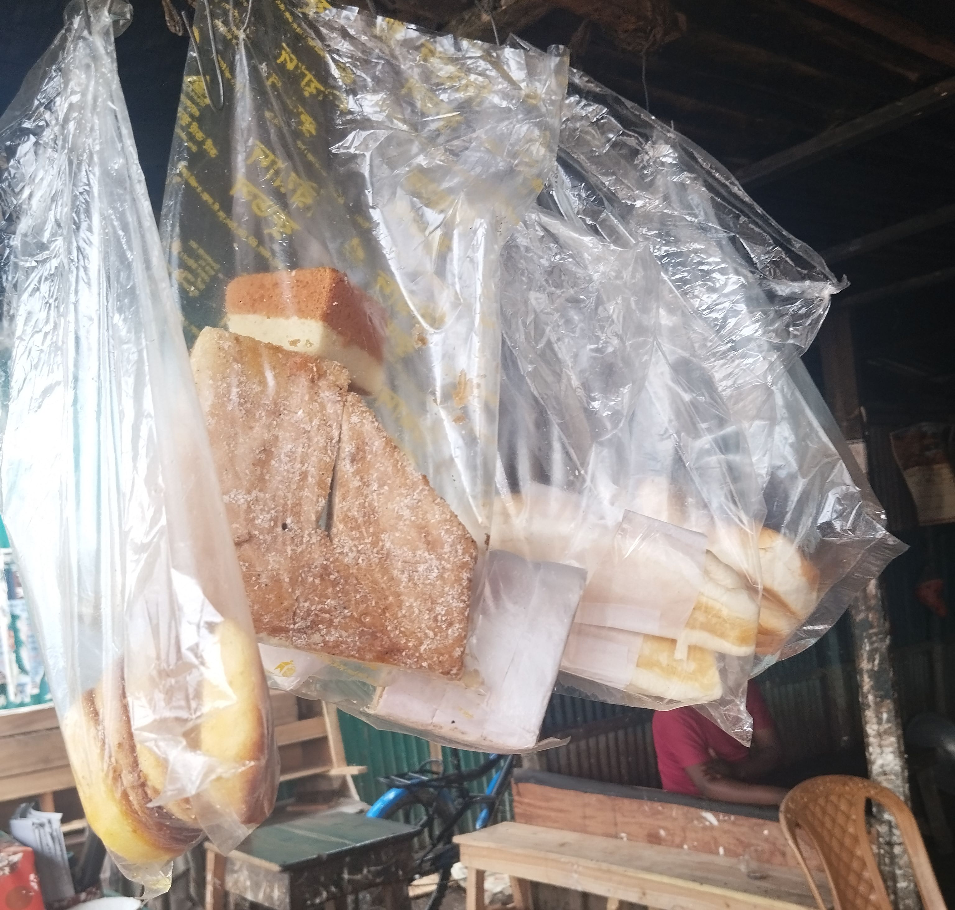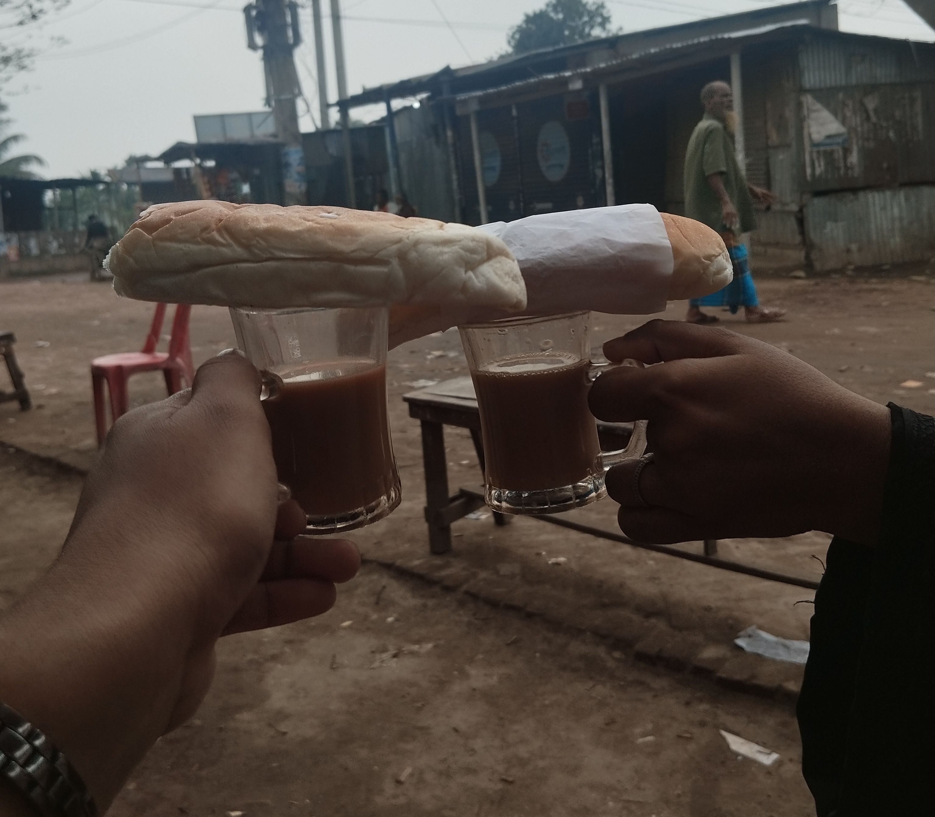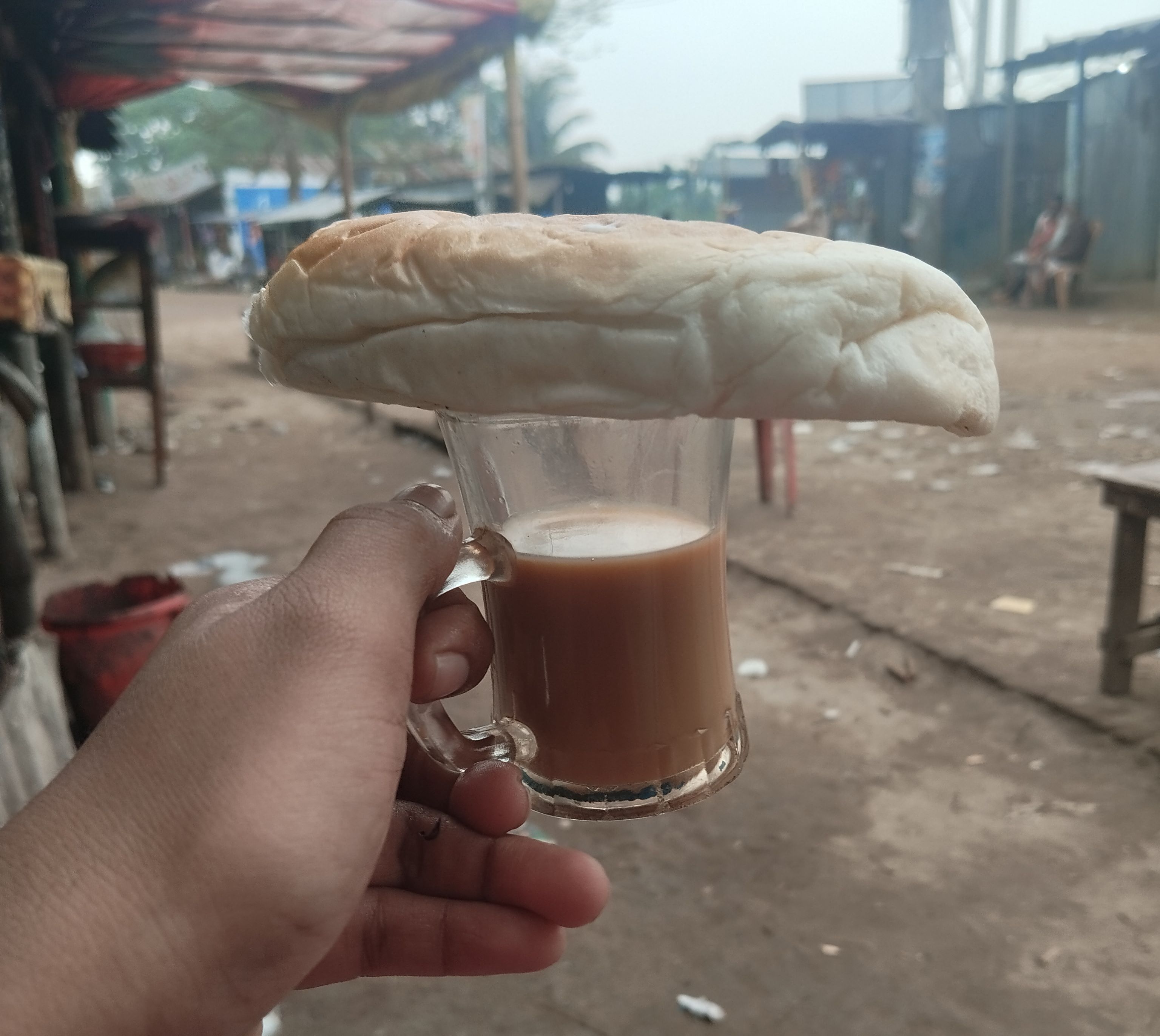 After entering a bakery, I first notice the cleanliness of the shop. Seeing a clean and tidy environment, it seems that the food here is prepared healthily. Then I look at the variety of food such as cakes, biscuits, pastries and bread that attracts me. Finally, the golden color of the bread and its freshness come to my attention, which easily shows that they are freshly baked. Since I went at 7 am, they were just making bread at that time. There were not many breads in the shop. I bought a bread from them for 10 taka. And, next to it, there was a tea kettle placed on the stove. All the shops in Chikna More open by 6:30 am. And, they close around 1/2 pm. Tea is always a constant companion here. Along with, fried rice and, roti, bread and various cakes.