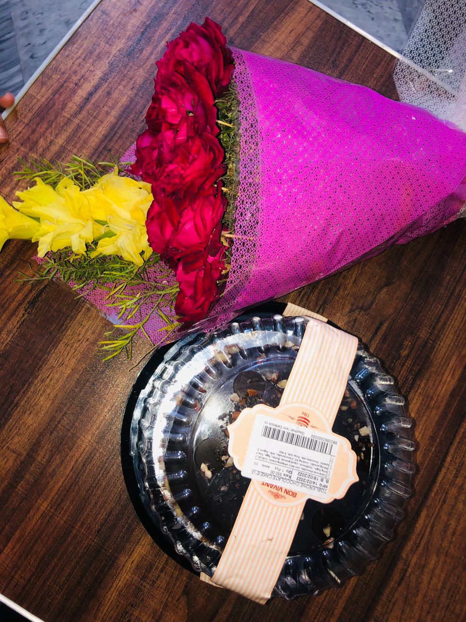 I came back home exactly at 4.40 pm. I was tired as well. There's another surprise waiting for me as well that I knew already actually. I received a small gift from my love of life. It was bouquet 💐 and my favourite chocolate cake. I am big big fan of the sweets. So he knows as well. Evening also spent so well with the roses 🌹 😍. Then I took tea made by my sister. I had not dinner beacuse I was already so full. Then I went to sleep little early.