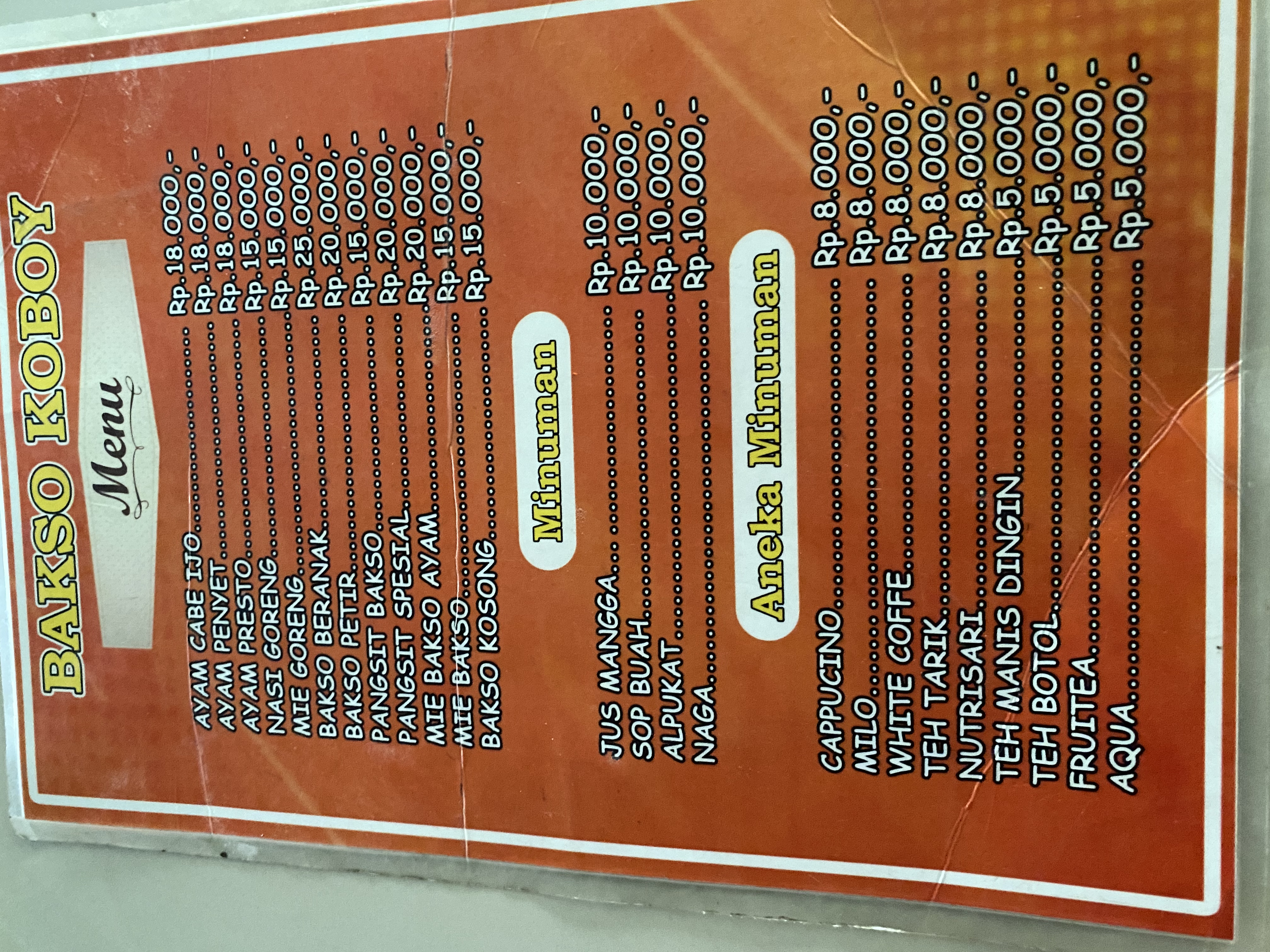 Rasa bakso disini pun sangat enak terasa gurih dari baksonya serta kaldu yang berbeda dari bakso lain. Nama warungnya Sangat unik sehingga kita berpikir apa ada bakso koboy. Bakso Koboy hanya sekedar nama warungnya akan tetapi mie baksonya sama dengan mie bakso pada umumnya, yang membedakan adalah rasa dari mie baksonya. Tetapi disini terdapat menu yang berbeda dari warung bakso lain yaitu bakso petir.