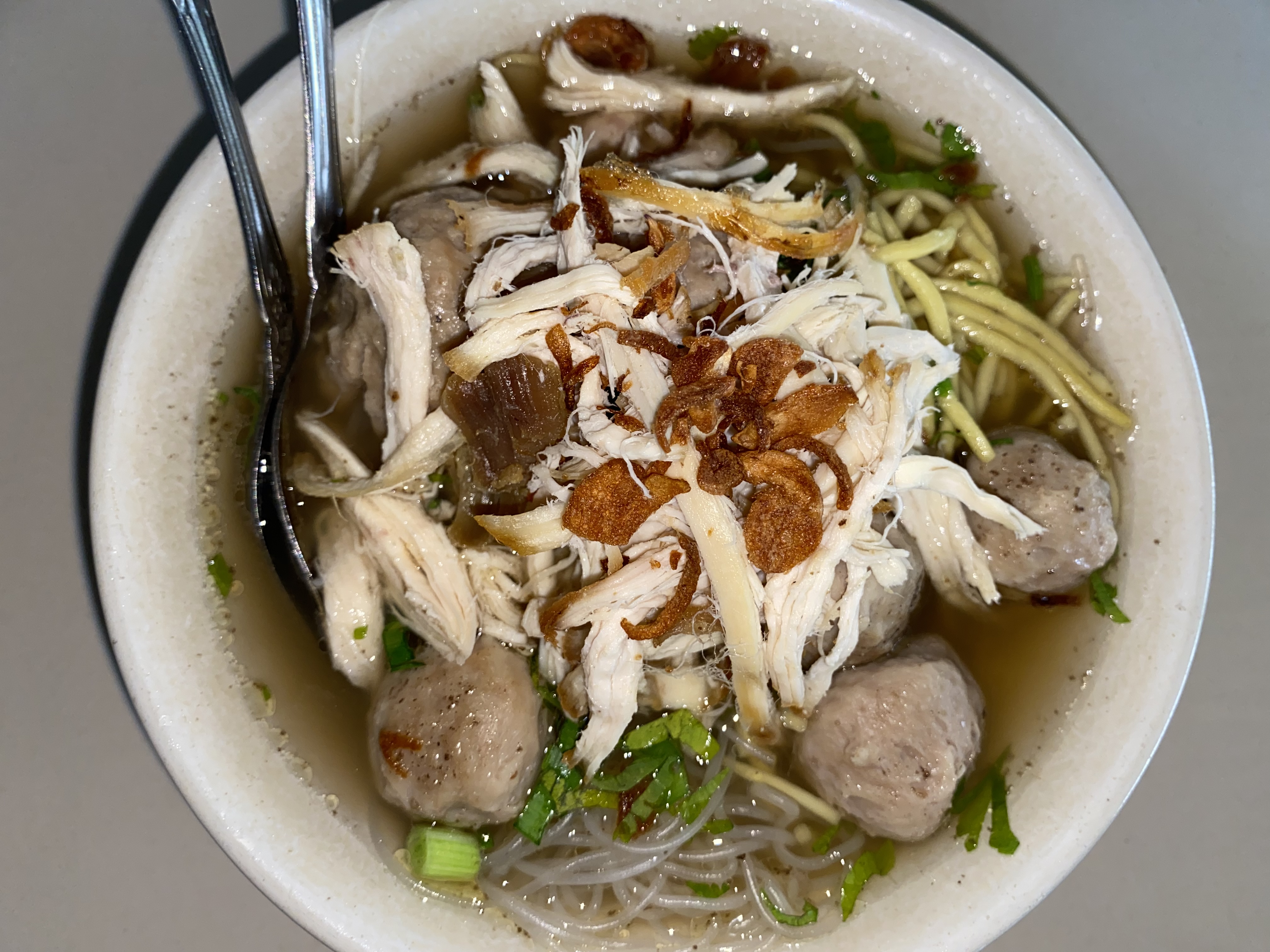 Mie bakso ayam dengan toping ayam yang diisi banyak.