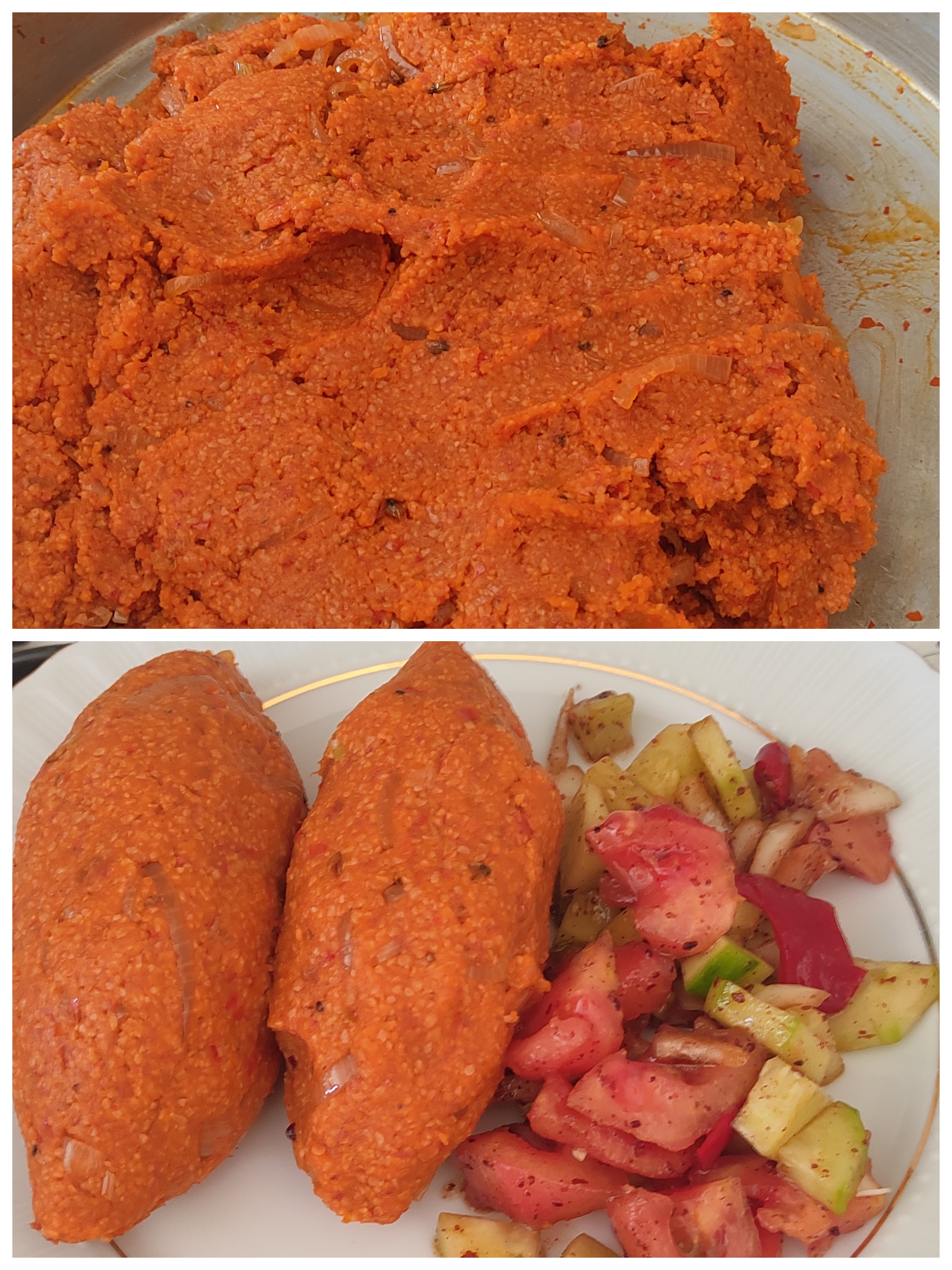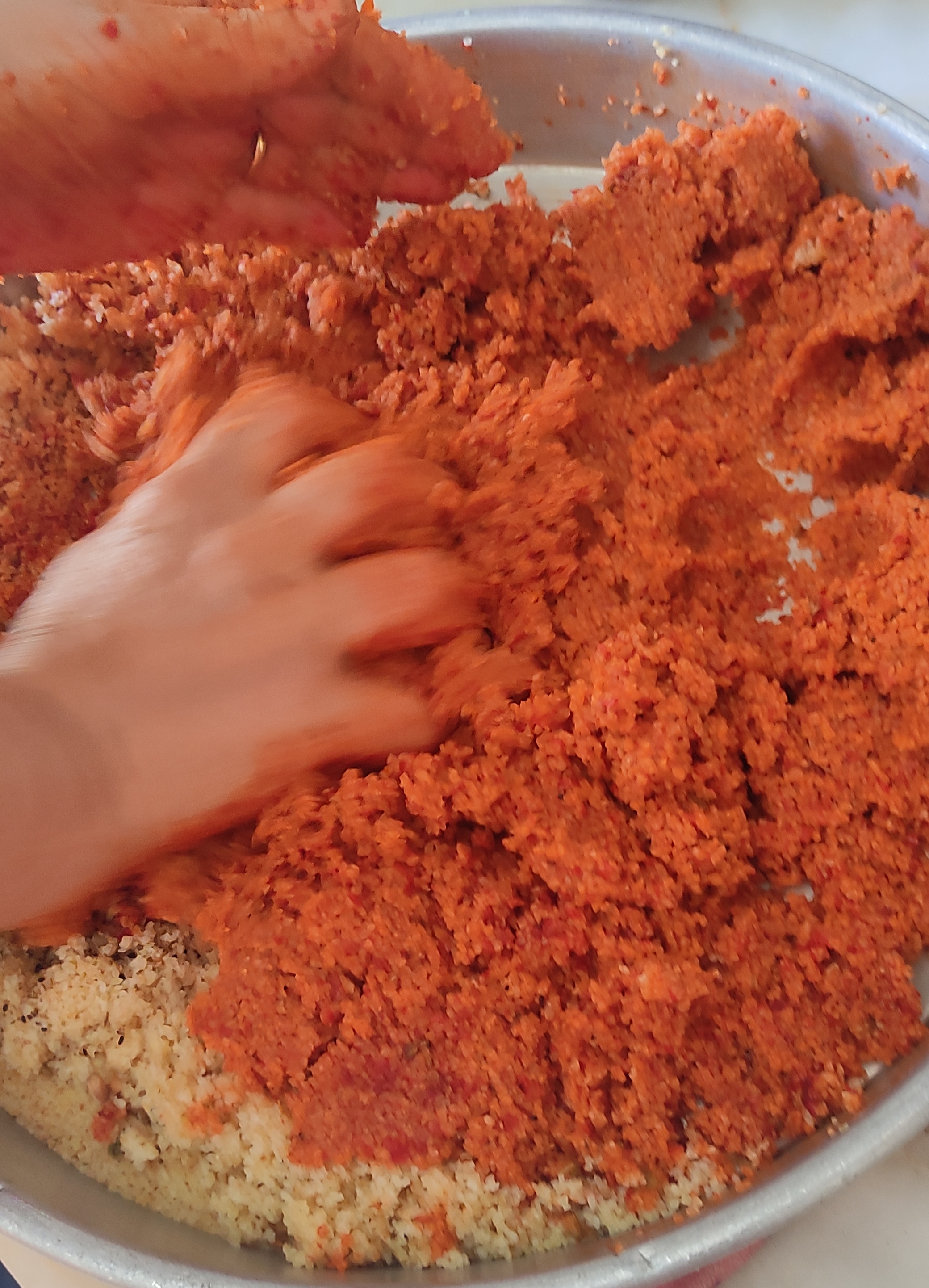 Bir taraftan da teyzem tepsiye koydugu ince bulgurlarin üzerine sıcak su döktü ve suyu süzdü. Daha sonra bulgura biraz fesleğen koyup beklettik. Biber salçasını da koyduğumuz bulguru teyzem harmanlamaya başladı.