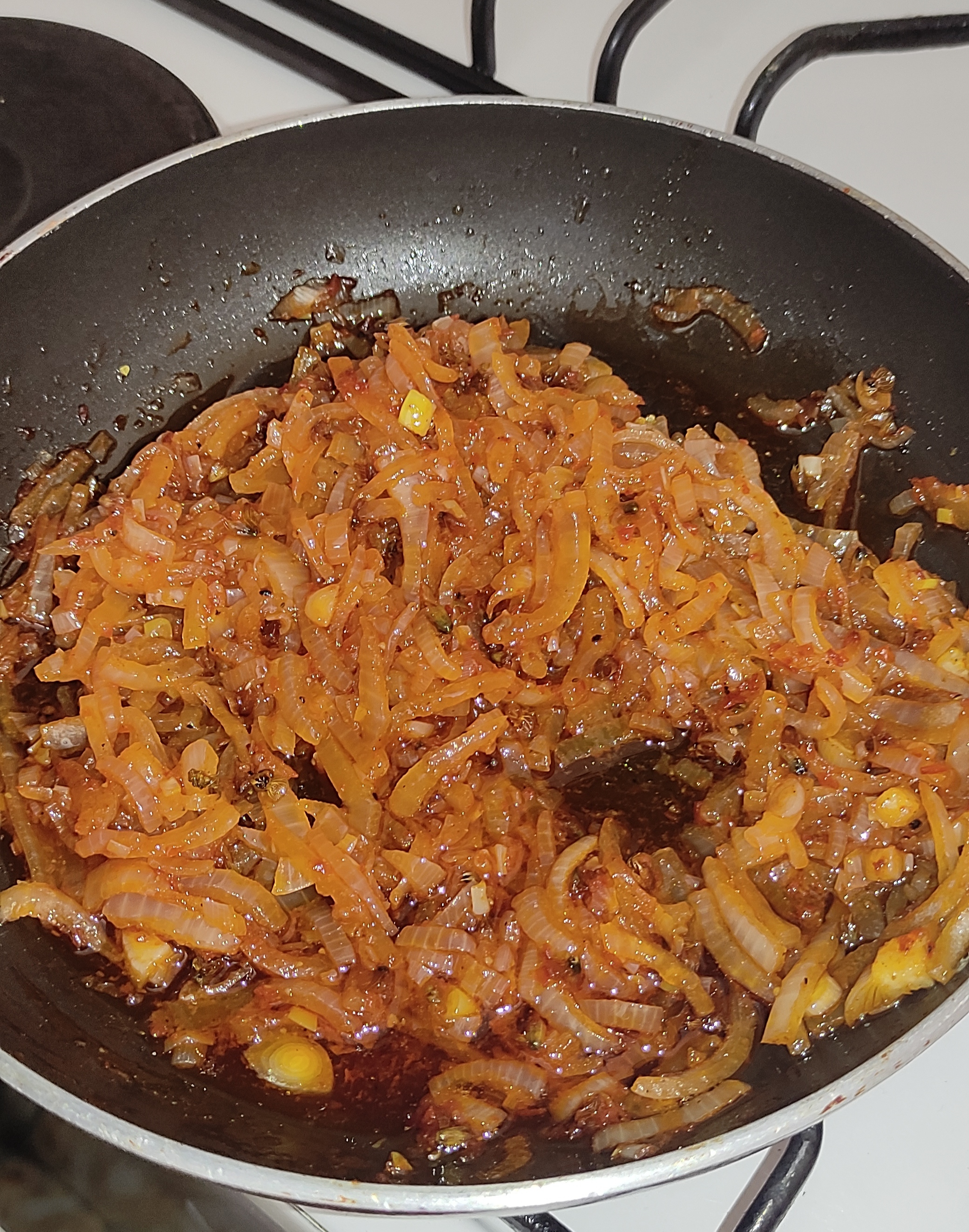 Herkes bir iş yapmaya koyuldu. 😄 Annemde ocakta tava içerisine kıyılmış soğan, fesleğen, biber salçası, kimyon, karabiber beşlisini zeytinyağı ile kavurdu. 😋😋