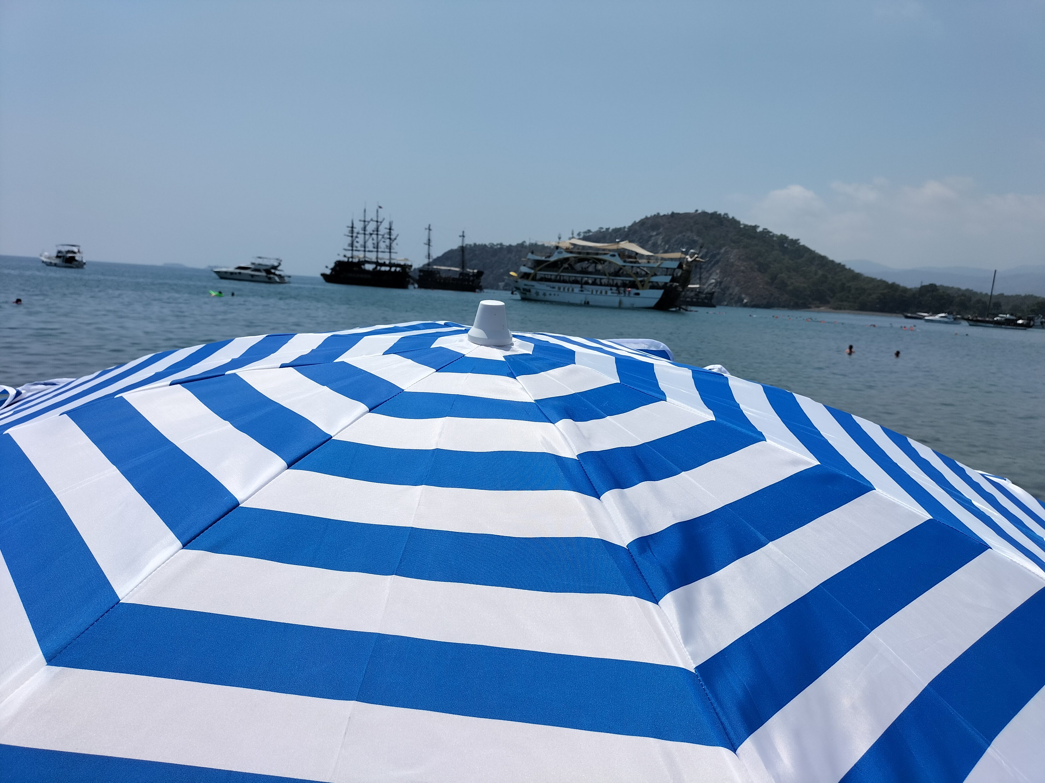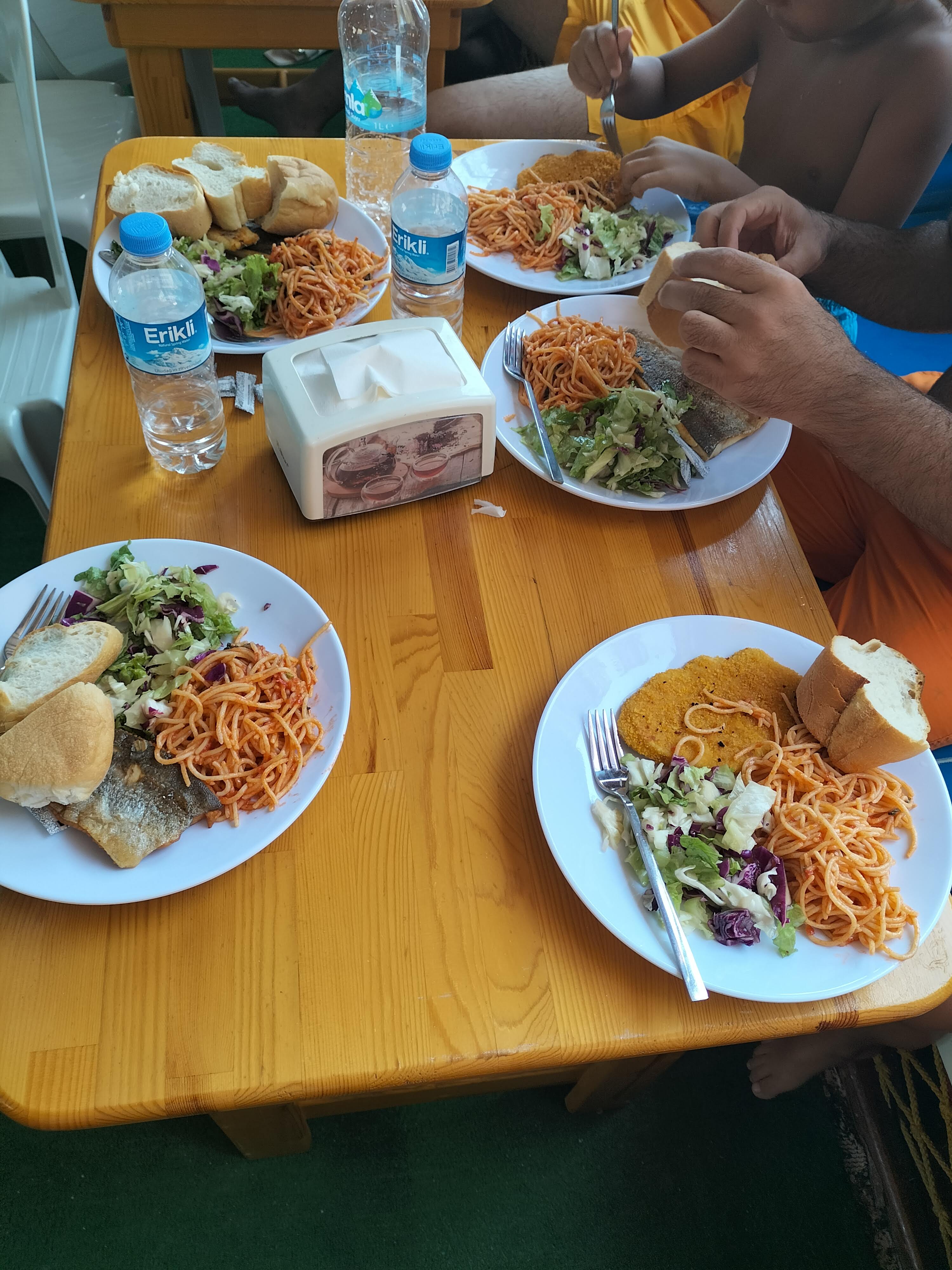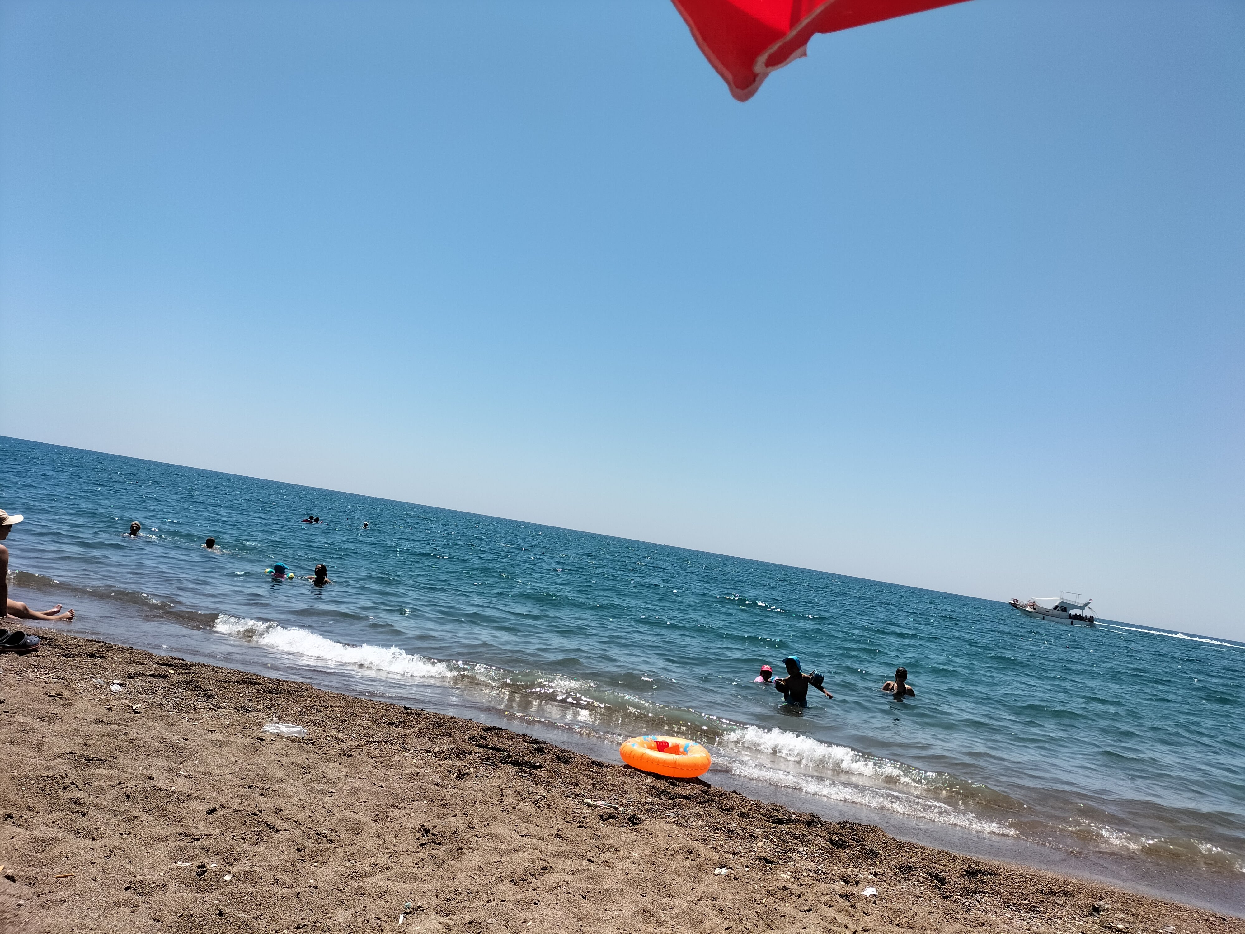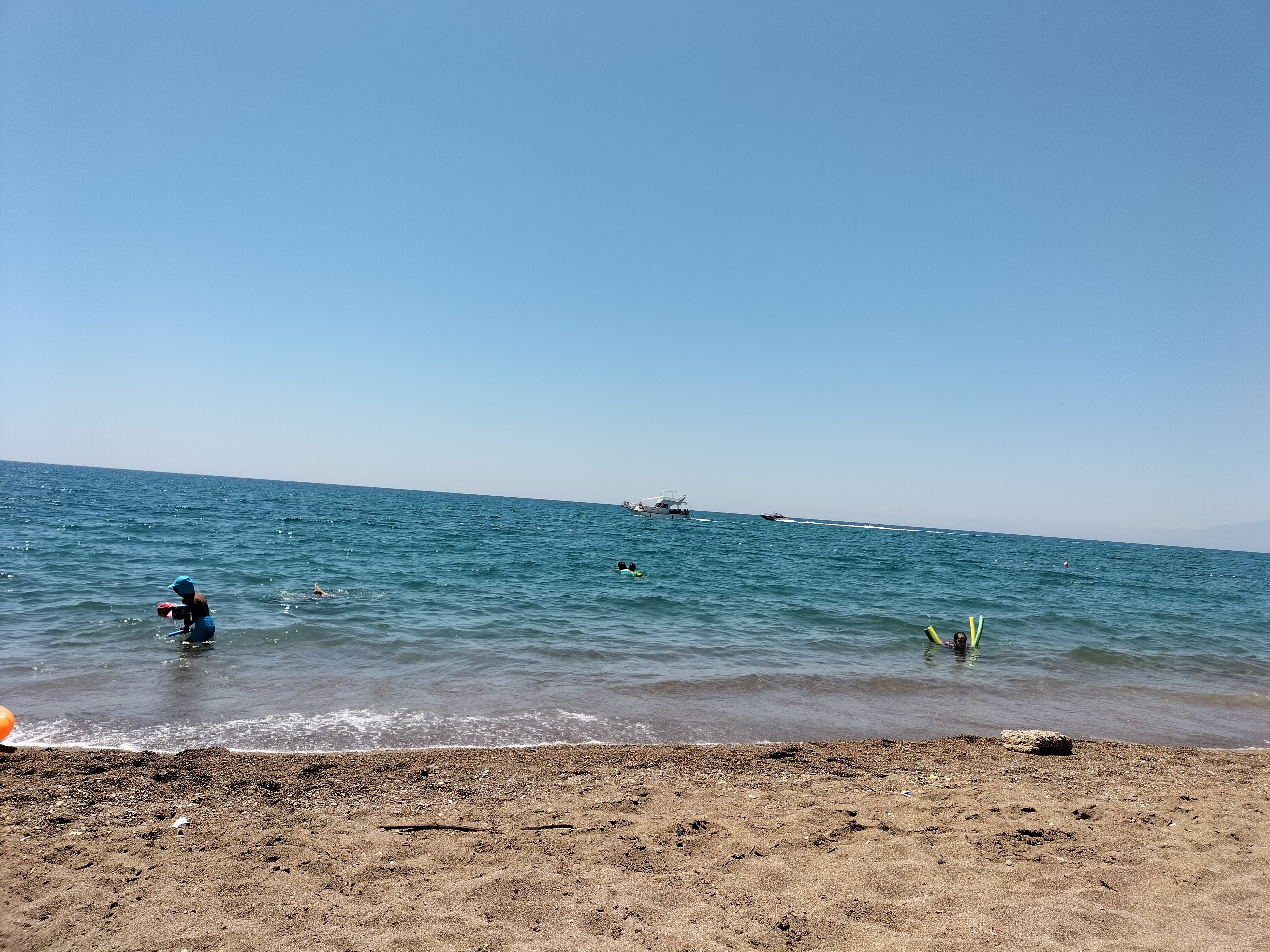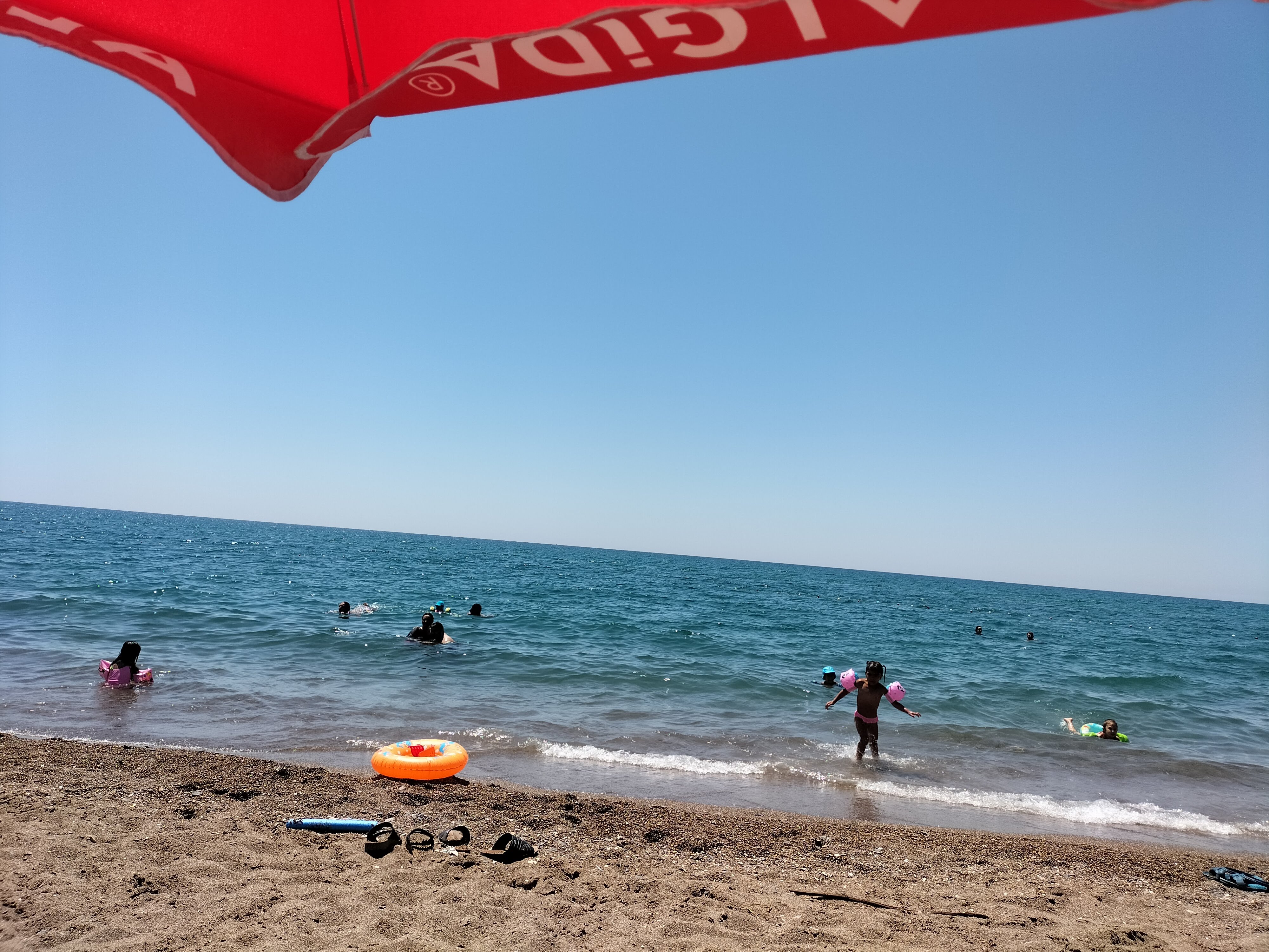 Hava o kadar sıcak ki, şemsiyenin altında bile bunaldık. Bizde çocuklarla birlikte serinlemek için denize atladık. Deniz çok temiz ve berraktı. Suyun sıcaklığı da gayet iyiydi. Abim ve çocuklar Karadeniz suyuna alışık oldukları için, onlara bu tuzlu su oldukça sıcak geldi. Karadeniz de şu anda suyun sıcaklığı 16 dereceymiş. Burada ki suyun sıcaklığı 25 derece yazıyordu. Su da hep beraber oyunlar oynayarak, birbirimize şakalar yaptık. Zamanın nasıl geçtiğini fark edemedik.
