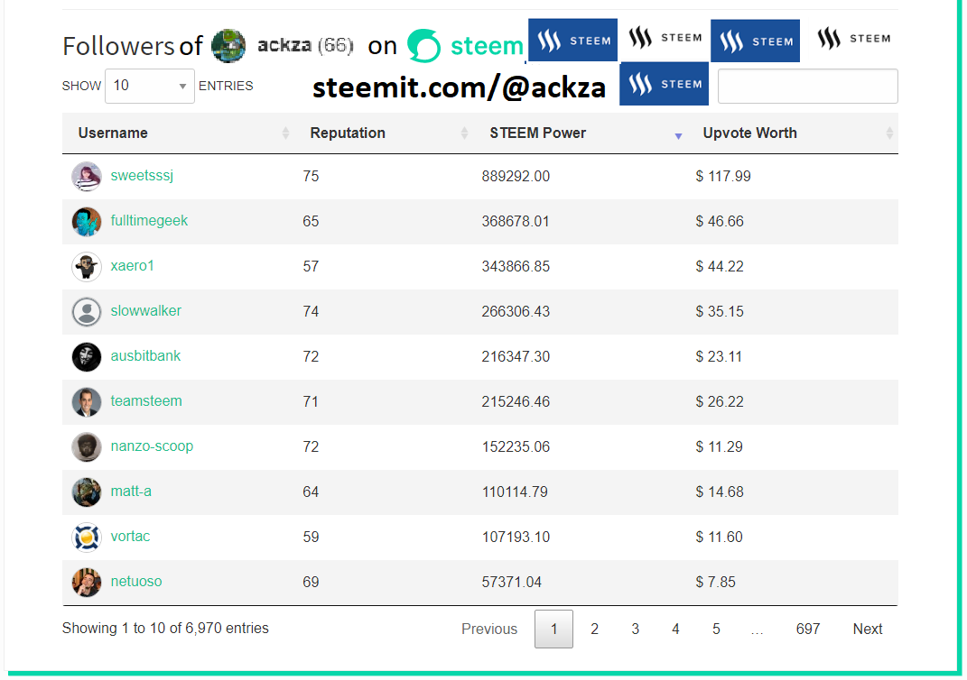And it looks like we have Total accounts: 885,820 so if I can get to 8859 followers I would be at 1% of total accounts on Steem following me, but I am closer to something like 10% of the nearly 70,000 Daily ACTIVE accounts on the steem blockchain! I hope I can get to 10,000 and by the way, most of my followers have SP, I have few followers with no SP, my followers are al real accounts, you can check at https://steemit.com/@ackza/followers And you can see this list with extra data like sorting them by SP if you have the steemit extra info Chrome extension by @armandocat