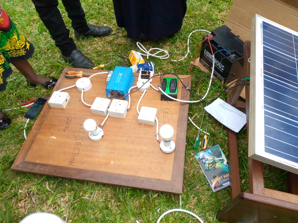 It contains the solar module, the storage battery charge controller and the inverter. A DC bulb and an AC bulb were able to light as shown.