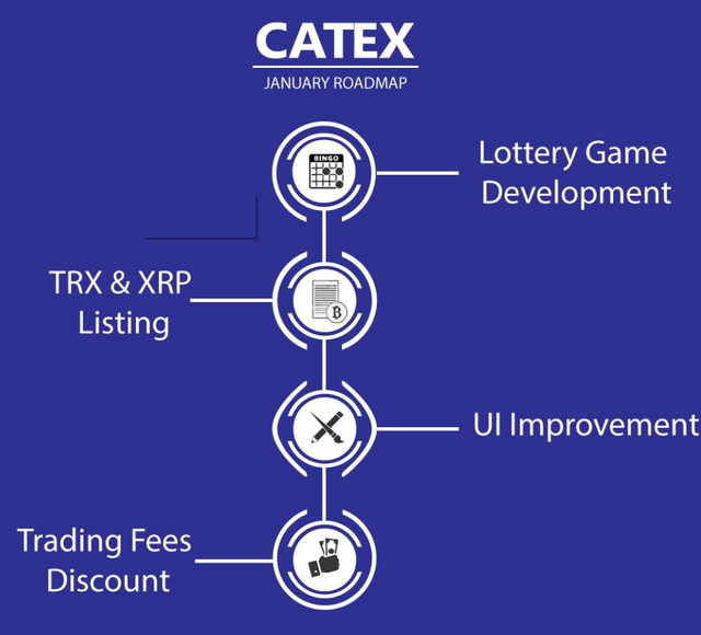 Wie Sie auf dem Bild sehen können, erklärt die Börse ihre Ziele monatlich. Zu den Zielen dieses Monats gehören beispielsweise niedrigere Provisionen, eine verbesserte Benutzeroberfläche, eine Auflistung von TRX- und XRP-Münzen sowie Lotterien / Glücksspiele.