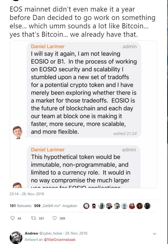 @Dan verließ Steem und Steemit 2017 und entwickelte Eos. Er ist seit 2009 dabei und hat schon mit Satoshi Nakamoto über Proof of Work debatiert. Man kann also sagen, @Dan ist einer der erfahrensten Blockchain-Entwickler der Welt. Seine Blockchains haben alle delegated Proof-of-Stake, denn @Dan hält nichts von großen Mining-Kartellen. Hardcore Cypherpunks und Crypto-Anarchisten wie @Nakamoto und @Buterin halten nichts von dPOS, weil es halt nicht dieses hohe Level an Dezentralisierung bringt. Steem ist auch recht zentralisiert.