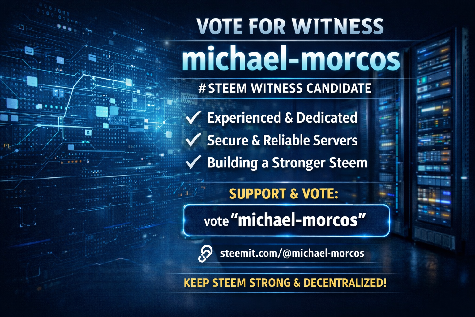 If you believe in a strong and decentralized Steem blockchain, please consider voting for my witness: