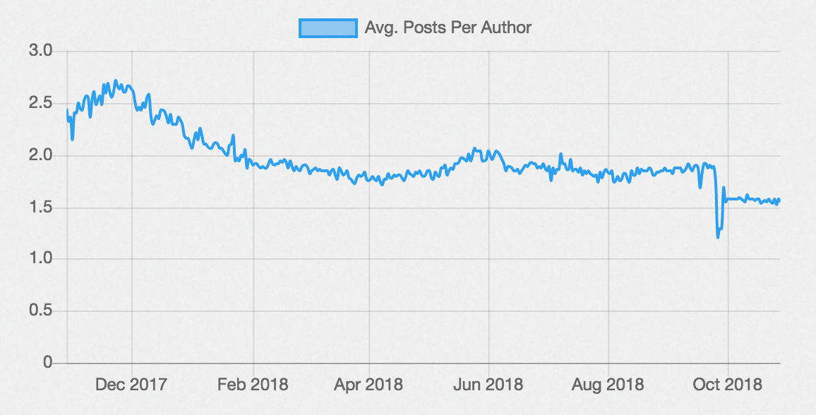 Good point. The tripling of authors between Dec 2017 and Feb 2018 also coincides with a steep decrease in the average daily posts per author. Now the number of authors is back to pre-peak level, but their productivity is not. Hmm I am curious now, I'll look for more detailed data on this.