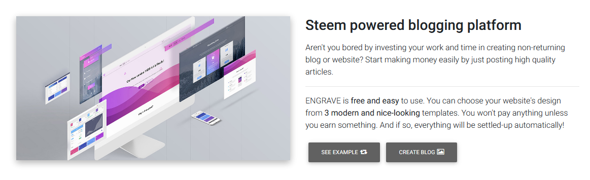 @Engrave is a blogging platform that is using STEEM for content storing and monetization. New post created using @engrave will also show up on your "normal" steem blog so it's kinda like a steem interface. What's different is the focus on creating a professional blog with things like templates, SEO optimizations, domain management, web push notifications, technical support etc. One thing to notice is that the service takes 5% fee from the post payout.