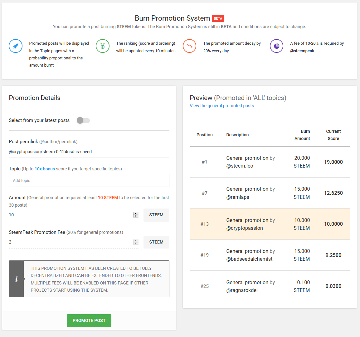The cool think is that when you are paying for promotion, around 80% of your payment is burned and 20 % is taken by steempeak to support further development. You can also see a small "leaderboard" that gives you an idea how often your post will be featured in the promoted spot and how much you need to pay to be #1.