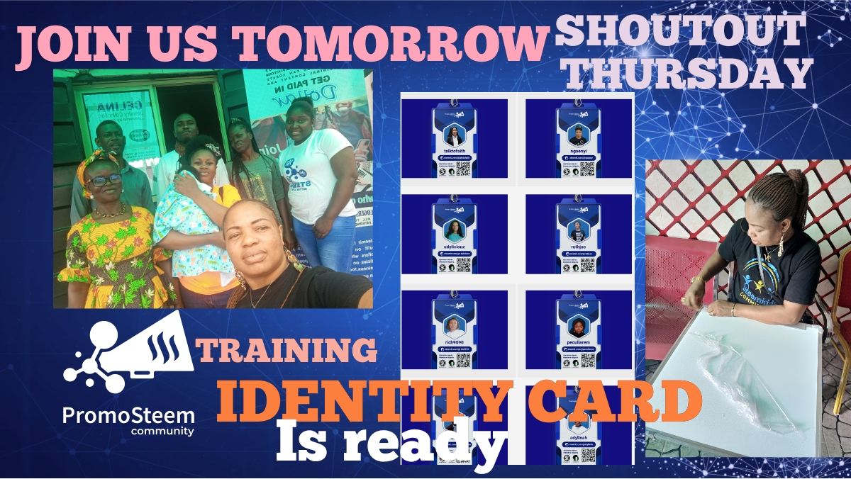 Greetings to you all dear promosteem community members in Nigeria, I welcome you all back to a new week and to a day of promotion again. It has been amazing promoting steem in Nigeria. We have all been having wonderful experiences so far. Tomorrow is another Thursday for shoutout, we will also hold a physical training at my steemit office for those who will like to be trained offline, also, our promosteem community ID card design is ready. Dear Nigerians, I want to invite us all a...