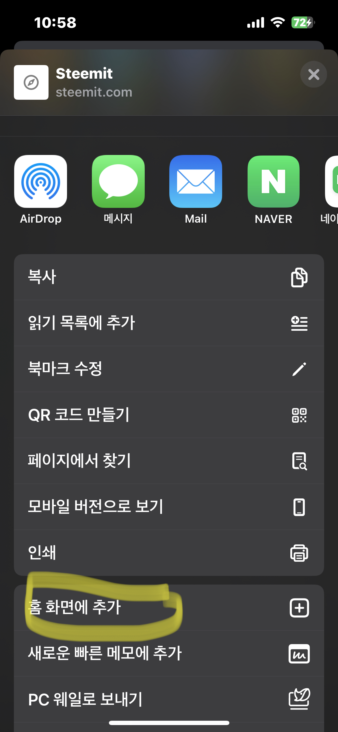 폰 바탕화면에 스팀잇을 앱처럼 홈화면 추가하는 방법pllas92226 (32)in #steemitapp • 3 years ago (edited)스팀잇을 스마트폰에서 앱처럼 홈화면에 추가하는 방법을 작성해보겠습니다 ~ 크롬 어플을 일단 다운 받아야 하고, 크롬으로 스팀잇에 접속합니다~! 스팀잇에 들어와서 상단의 노란표시 부분을 클릭해요 아래로 조금 내려보면 ‘홈 화면에 추가’버튼이 있으니 클릭합니다 그럼 폰의 홈화면 어플처럼 스팀잇이 생깁니다~ #kr #kr-newbie #zzan #dblog
