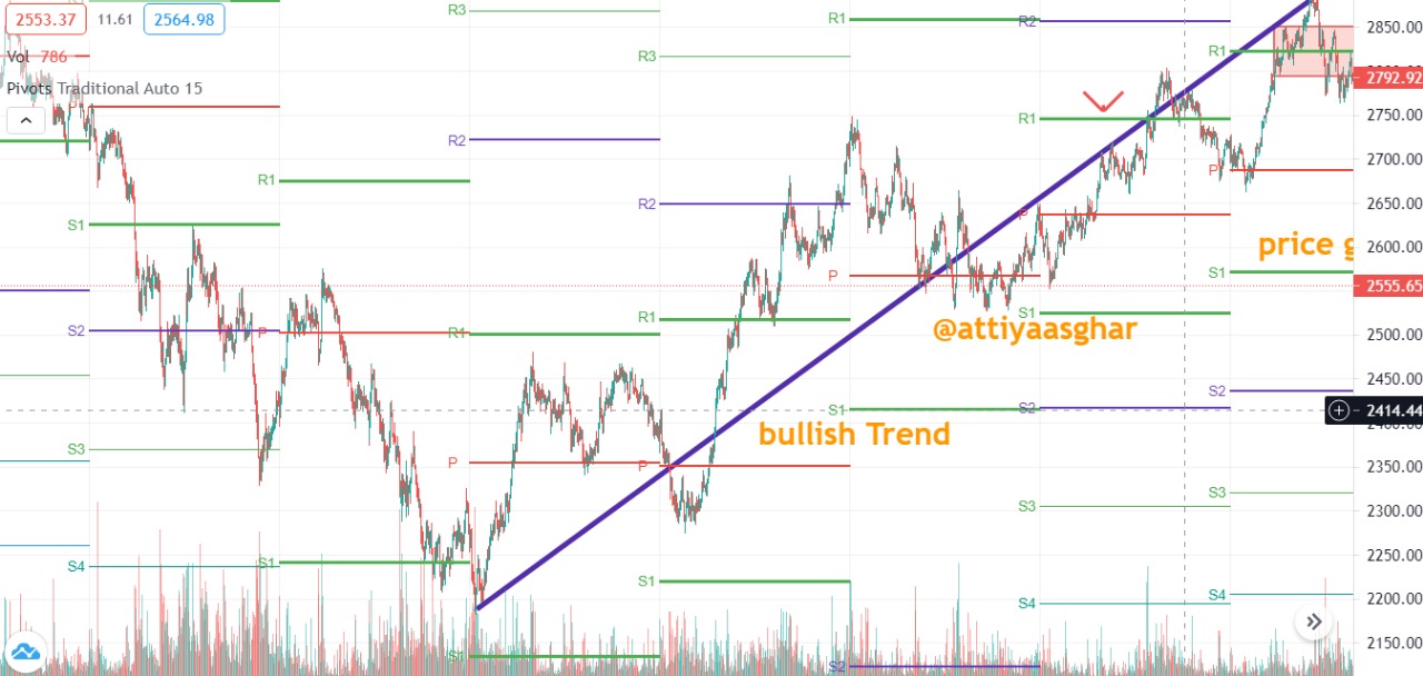 Bulish Trend : In bullish trend the pivot will indicate us how market goes up from support level to resistance level .as you can see price will go up S1 to R1 its called bulish trend . and that type movement give the good profit. if you want to take profit you must be trade on spot trading.