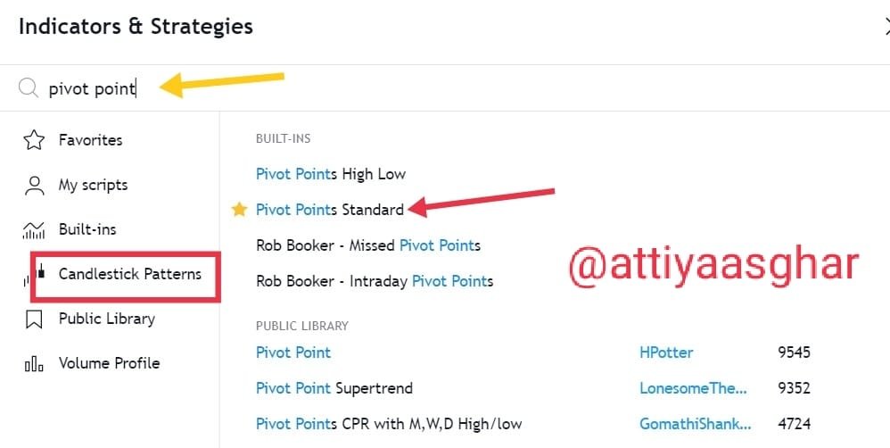 Step 2 is to search for the pivot point, a list of names will be appear, but you have to select the pivot points standards, as i have pointed with the help of arrow.