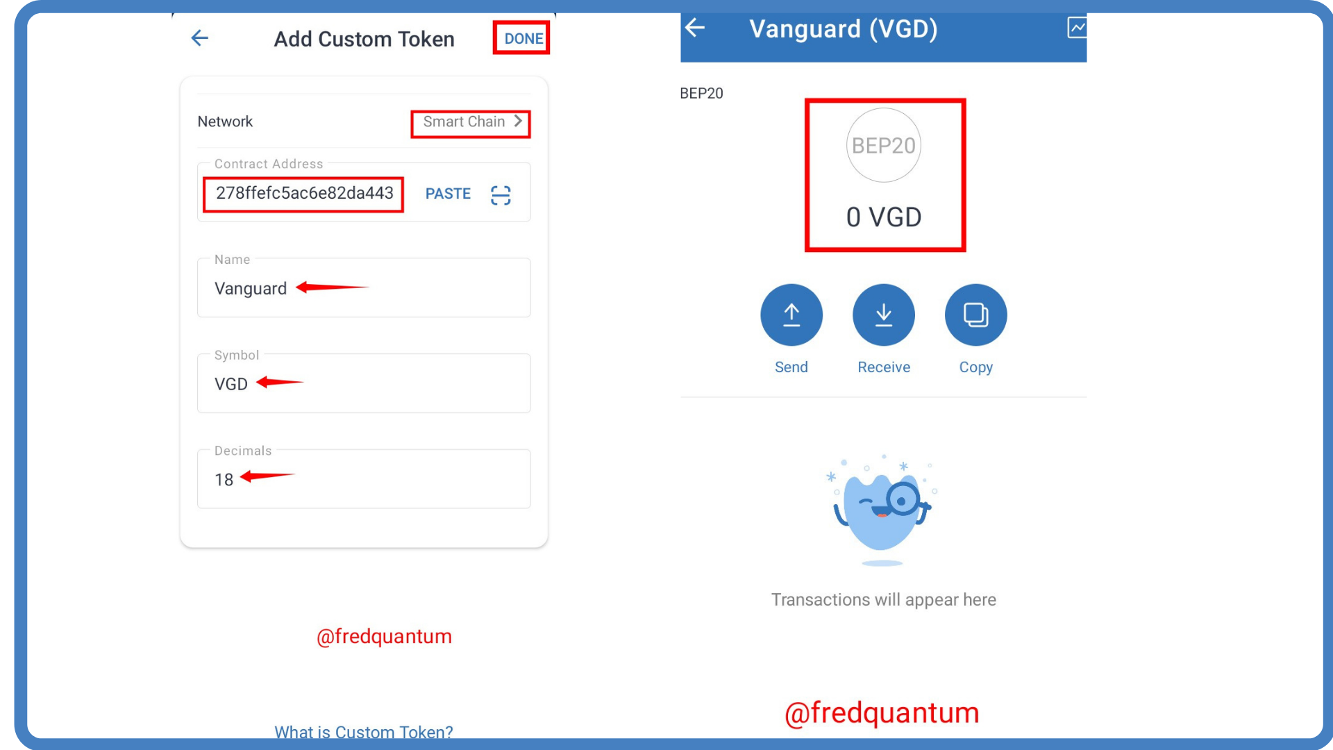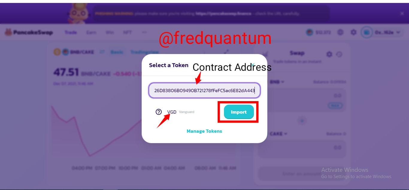 - I have been able to connect the wallet. I clicked the select a token on the swap interface of the DEX and pasted my token's contract address, my VGD (Vanguard) was displayed then I clicked the Import button. See the screenshots below.