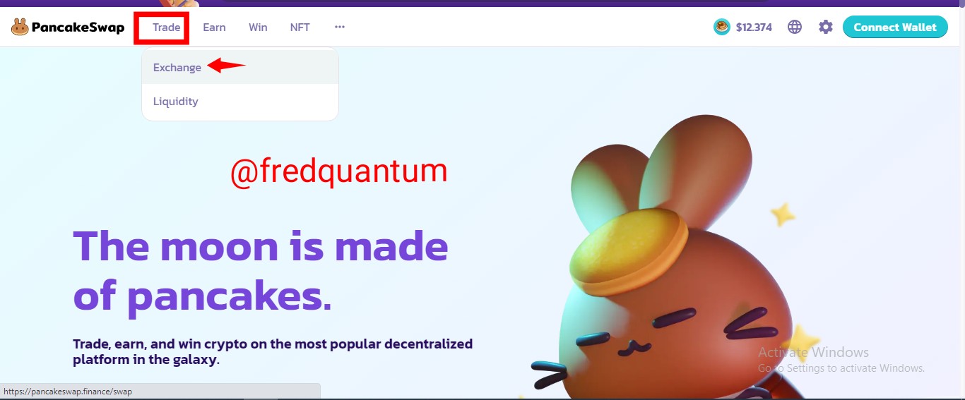 - I visited the website https://pancakeswap.finance/ and on the landing page, I selected Trade followed by Exchange.