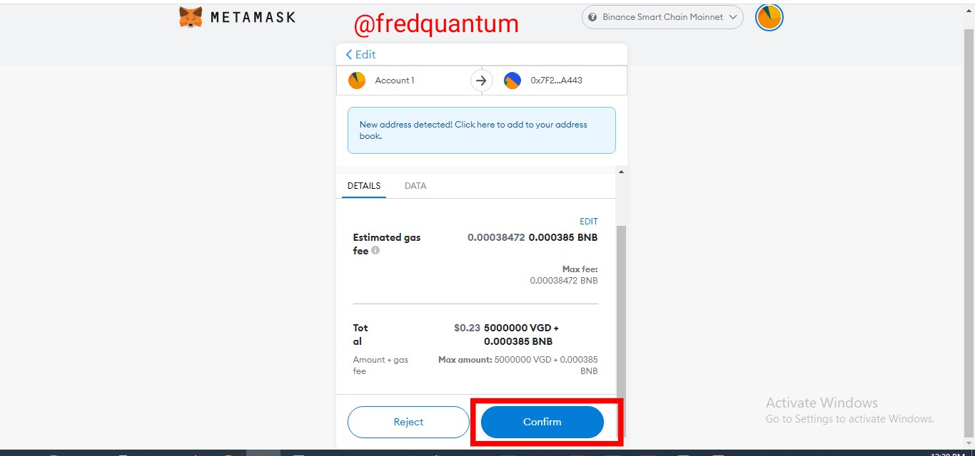 - The estimated fee for the transaction is 0.000385 BNB ($0.23) and I clicked the confirm button to complete the transaction. See the screenshots below.