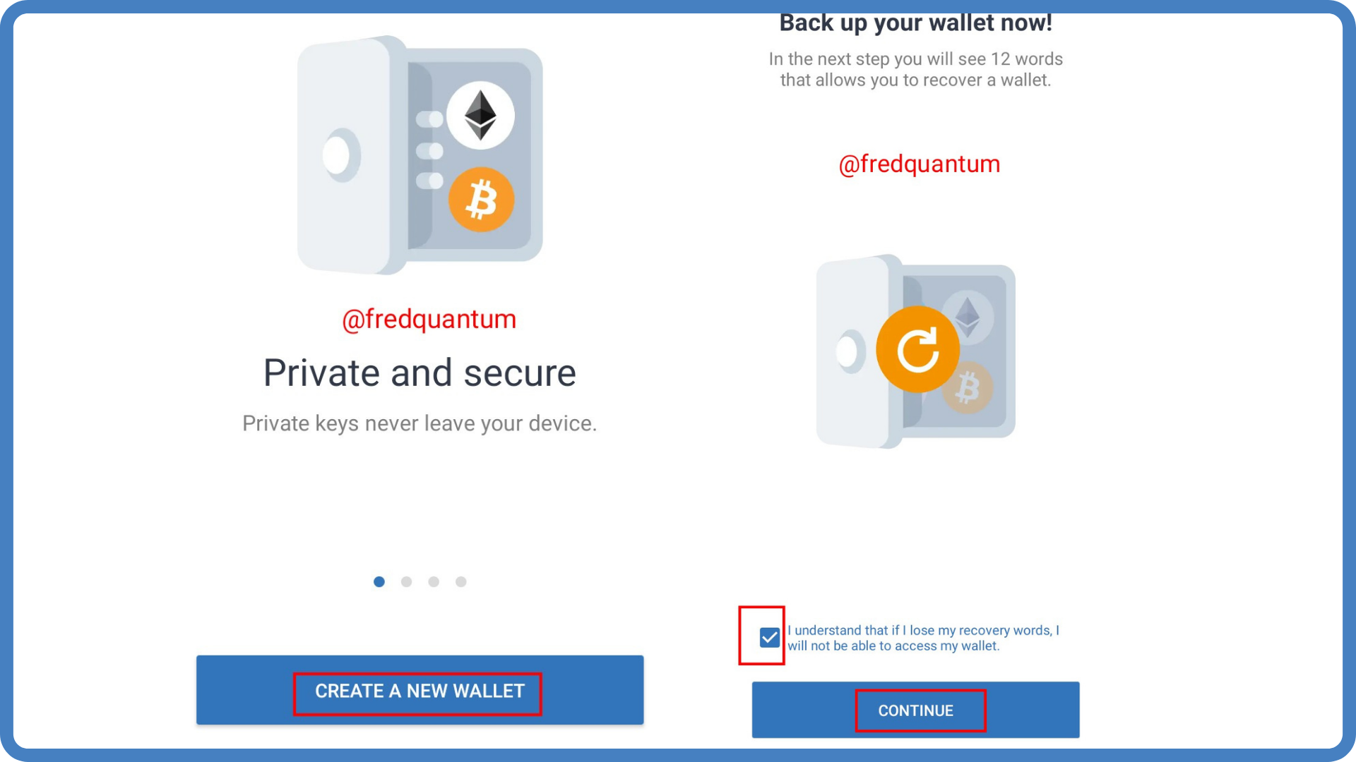 - I launched the Trust Wallet, selected Create a new wallet and on the next interface, it's time to write down the recovery phrase such that I ticked the box to show my understanding of how important the recovery phrase is, then I clicked the continue button. See the screenshots below.