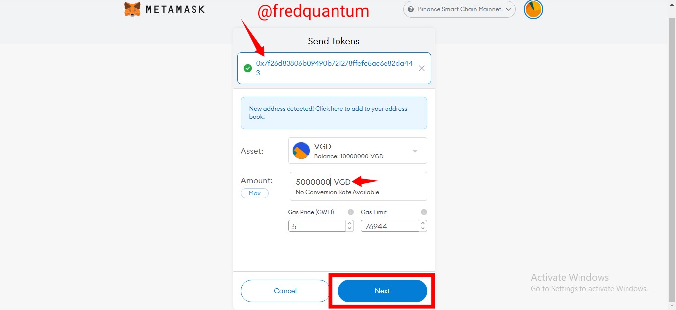 - Now, I pasted the token's contract address "0x7f26d83806b09490b721278ffefc5ac6e82da443", input the amount (half of the total supply) "5,000,000 VGD" then clicked the next button.